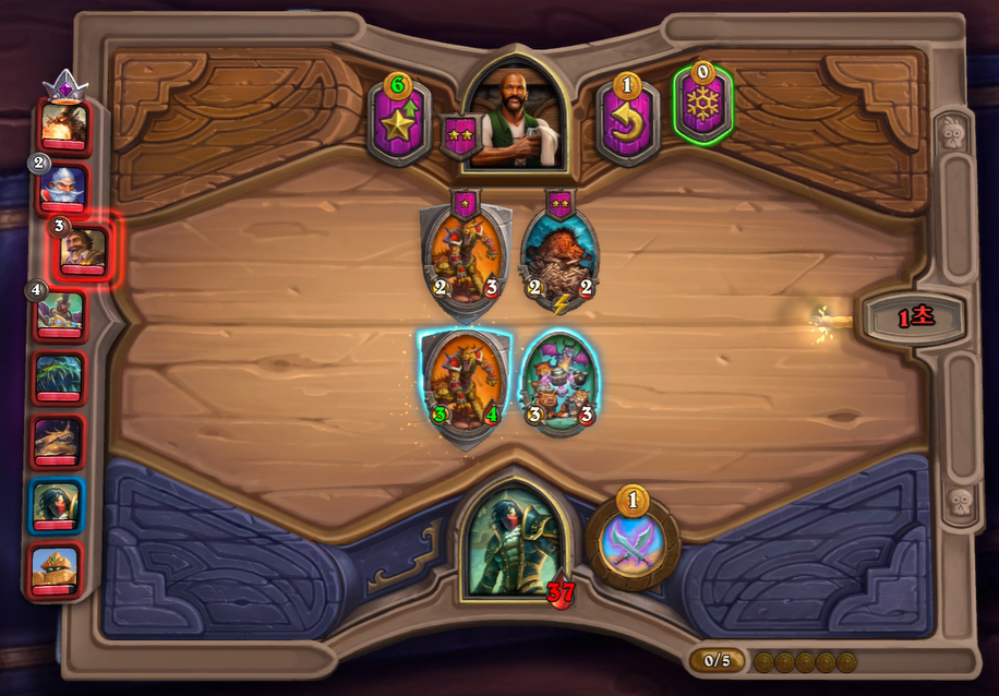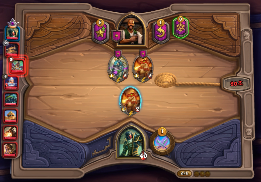 3턴 하수인 상점입니다.5골드가 굉장히 애매하고, 하수인 상점도 애매했습니다. 그래서 동물원 버프를 생각하면 부관한테 들어가는게 낫다고 판단해서 붉은 용을 팔고, 동물원 로봇을 구매했습니다. 하지만 사실 동물원 로봇을 사고, 붉은용을 놨두는게 더 좋았는데, 판단 미스를 했습니다.ㅠㅠ