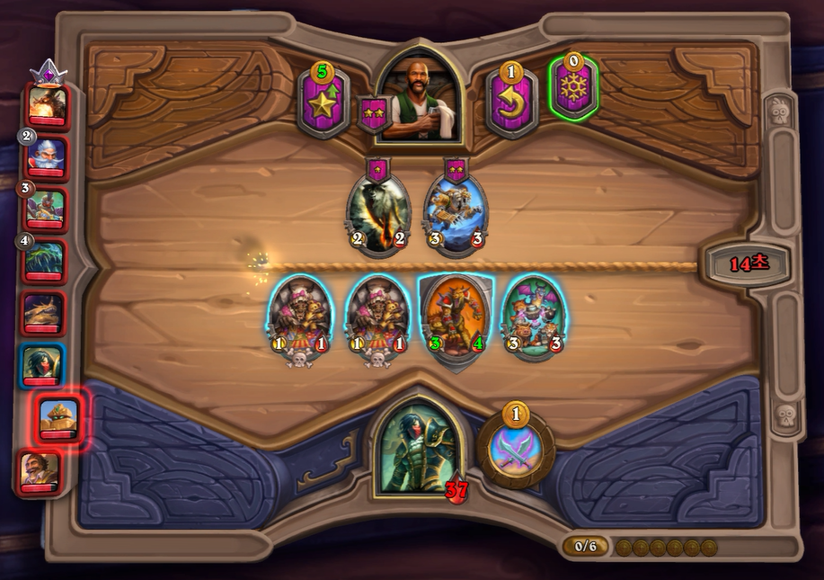 14턴 하수인 상점입니다. 다행스럽게 4등 안에 들었습니다. 이런식으로 벤클리프는 4레벨에서 버프 하수인만 찾아주면 4등 이내에 들어갈 수 있는 좋은 영웅이라고 강조하고 싶네요. 피라마드의 체력버프를 감안하면 이길 수 없다고 생각해서 상점을 얼려두었습니다.