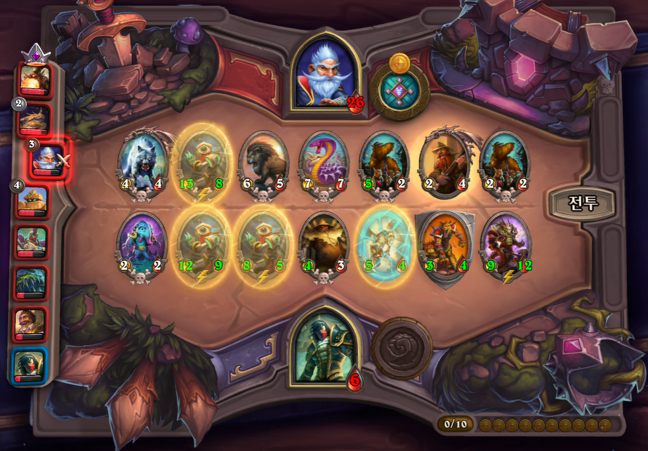 10턴 전투입니다. 상대 밀하우스도 말도 안되게 강력했습니다. 그래도 저렇게 죽메 토큰 하수인이 많으면 자리 부족으로 필드 시너지 효율이 덜 나와서 무승부를 기록했습니다. 애초에 이길수는 없었는데, 방울뱀을 일찍 잡아 운 좋게도 무승부를 기록했습니다!