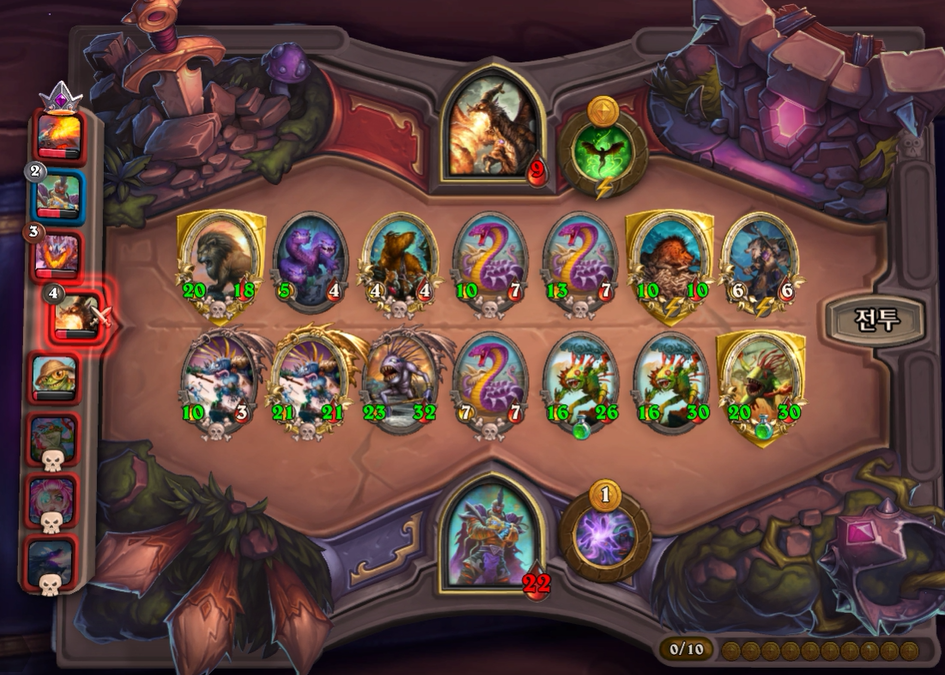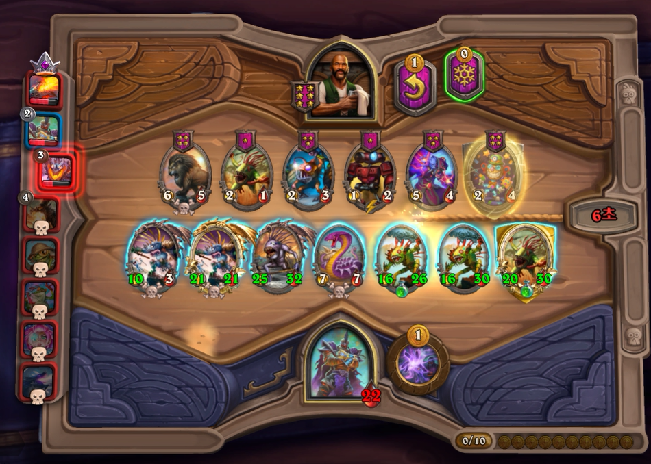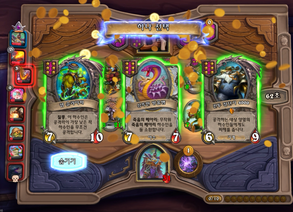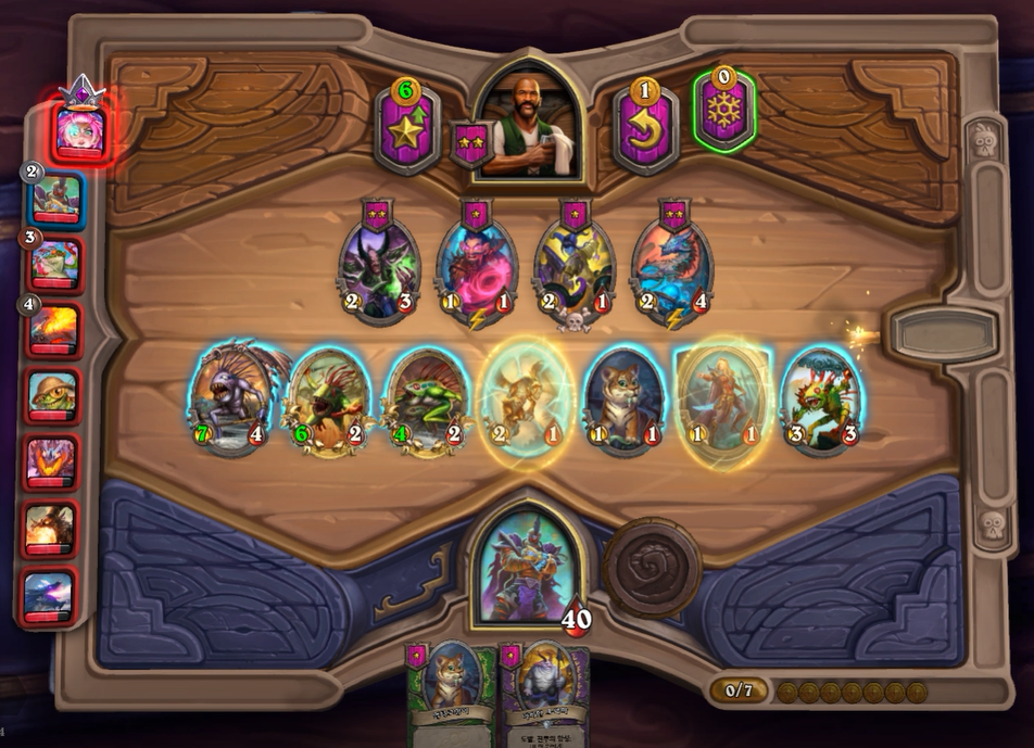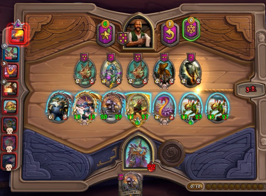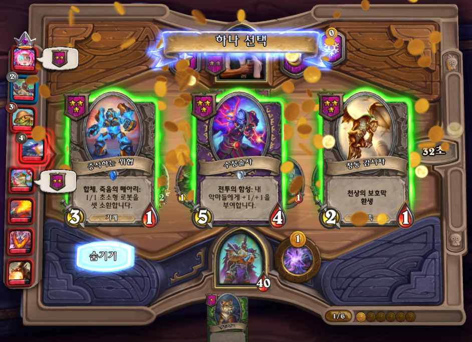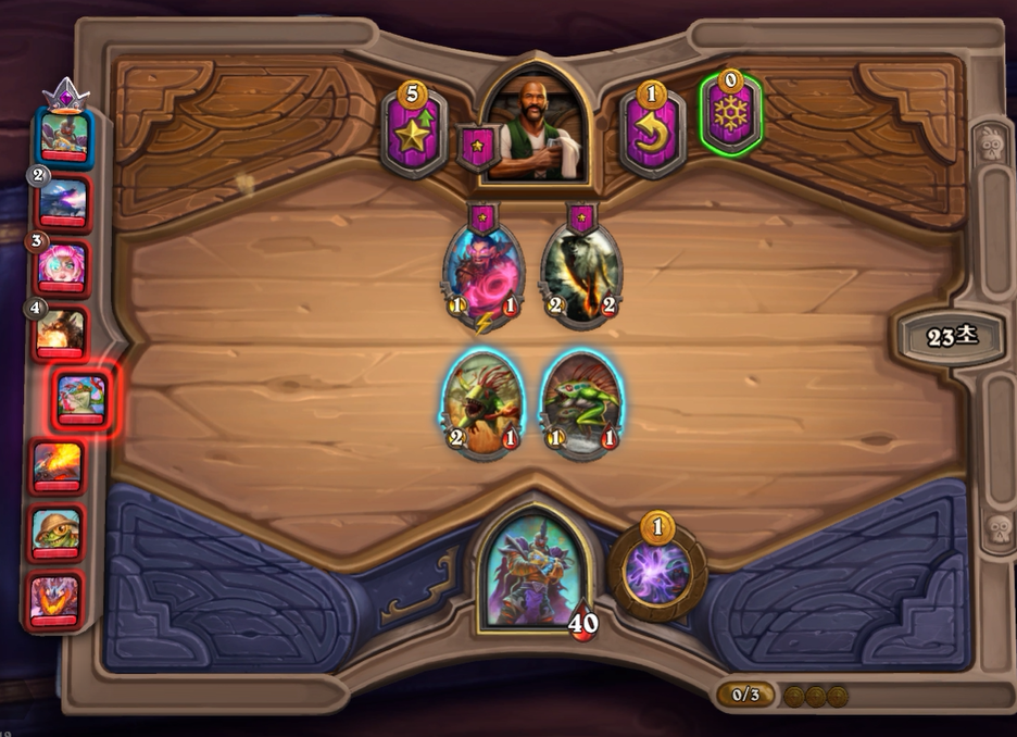 5턴 하수인 상점입니다. 보통은 레벨업을 하나, 멀록 2마리 유혹덕에 레벨업은 한턴 미뤘습니다. 전턴에 가져온 하수인들은 혹시 몰라 일단은 팔지 않았습니다.