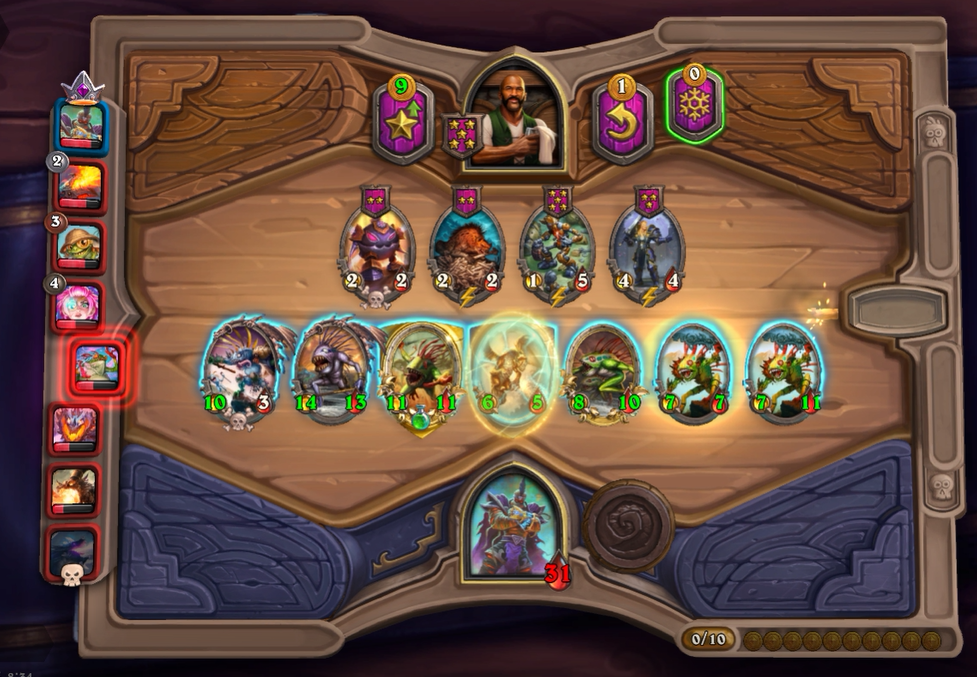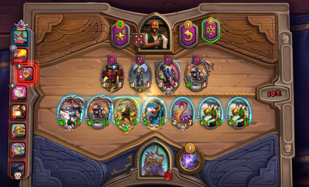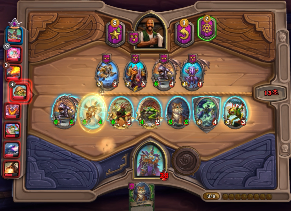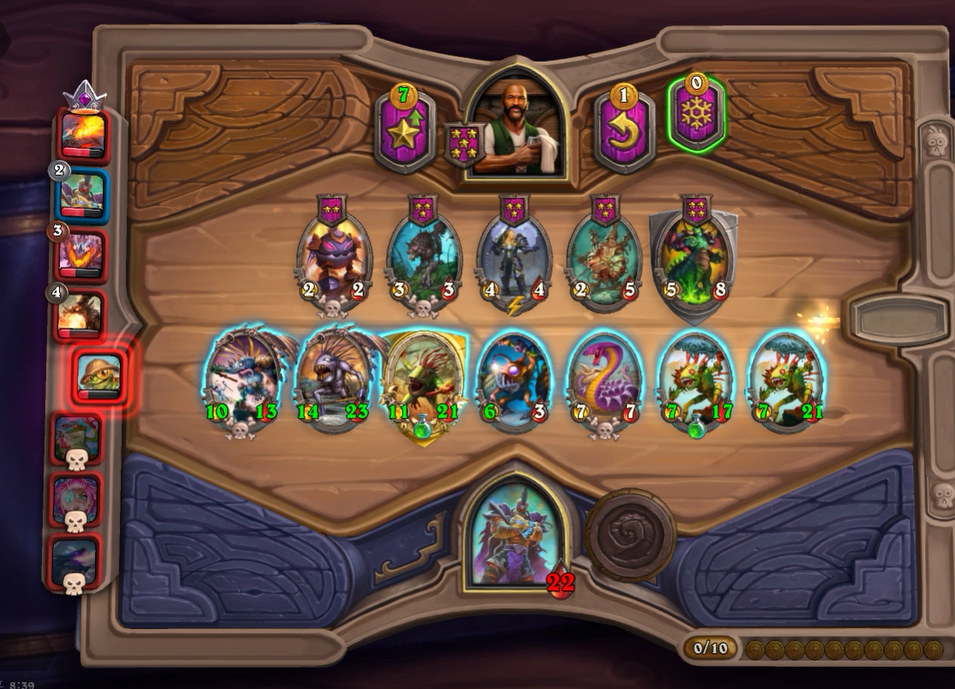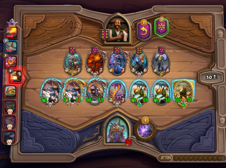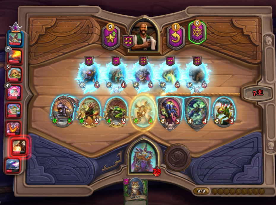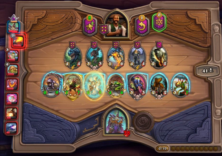 5턴 하수인 상점입니다. 보통은 레벨업을 하나, 멀록 2마리 유혹덕에 레벨업은 한턴 미뤘습니다. 전턴에 가져온 하수인들은 혹시 몰라 일단은 팔지 않았습니다.