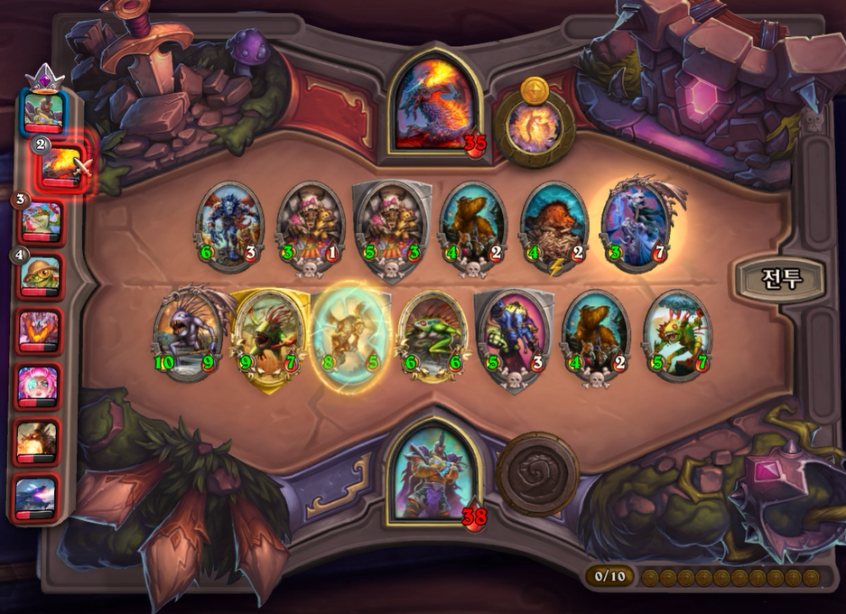 10턴 하수인 상점입니다. 브란이 뜨지는 않았지만, 멀록 버프를 통해 필드를 강화해나갔습니다. 그리고 영웅 능력은 가급적 꼬박꼬박 누르는게 좋습니다. 이때 상대 플러글이 멀록이라 가져오면 매우 이득을 볼수 있습니다.