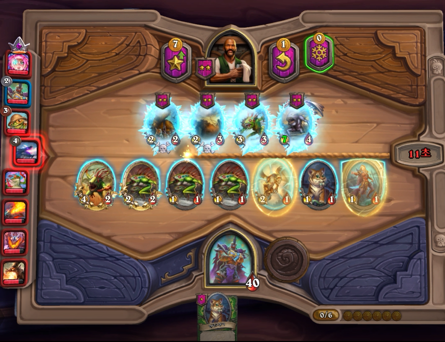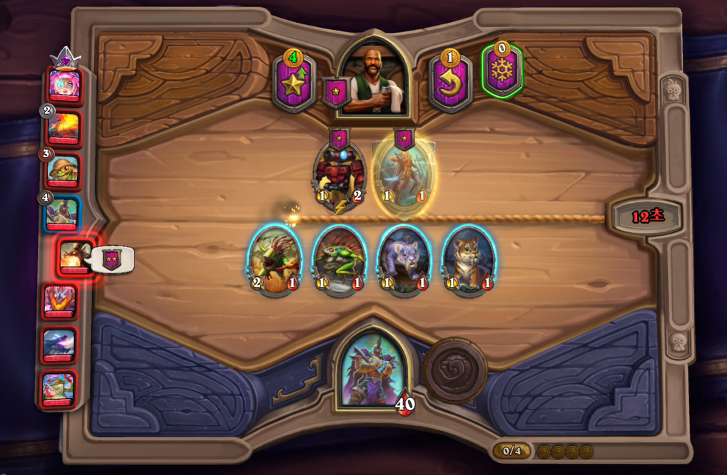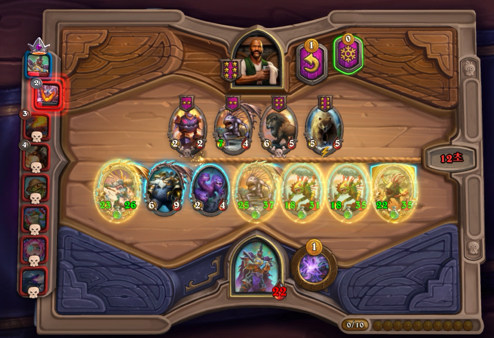 12턴 하수인 상점입니다. 레벨업 비용이 아직은 비싸기 때문에 최대한 버프를 돌렸습니다.