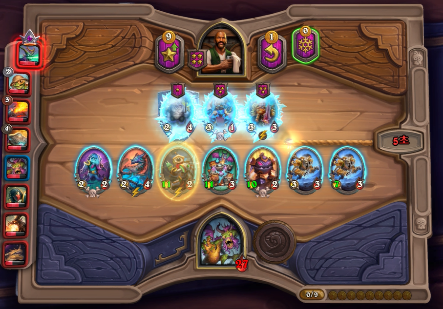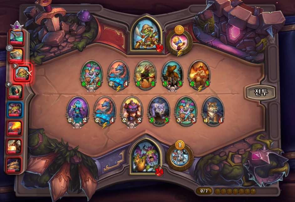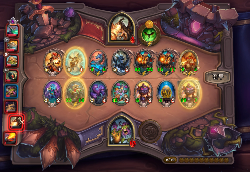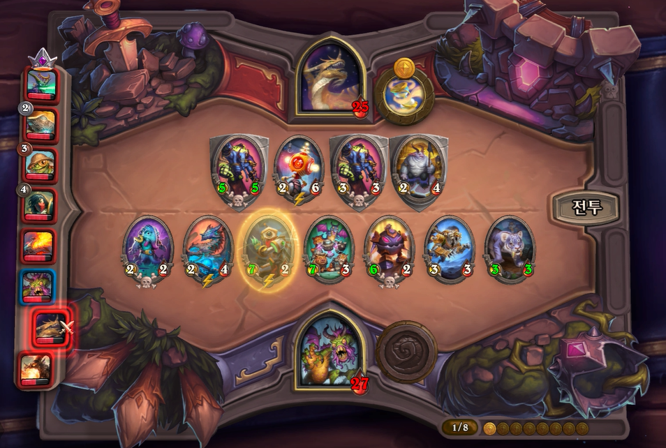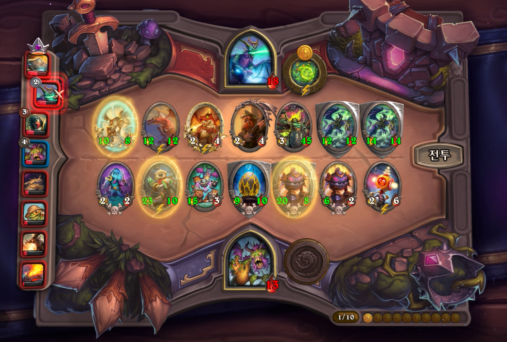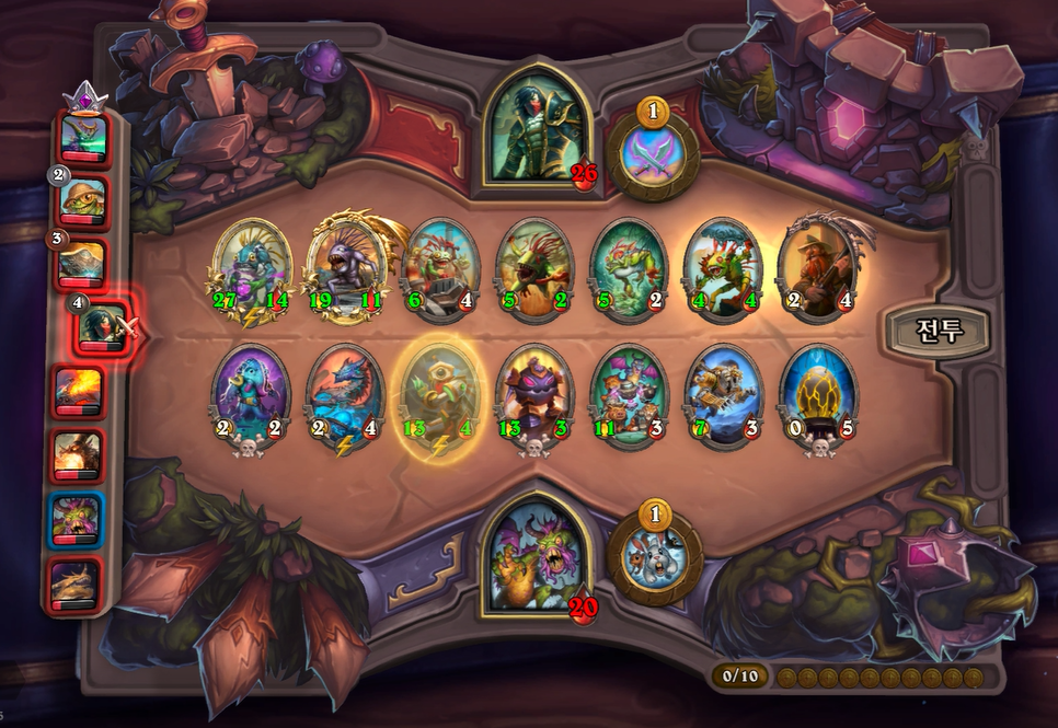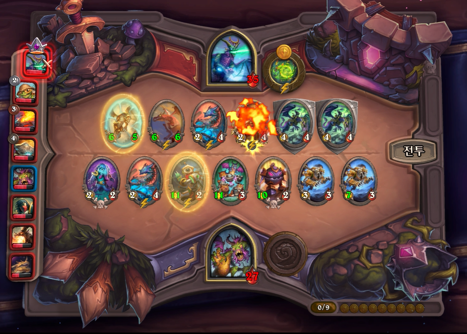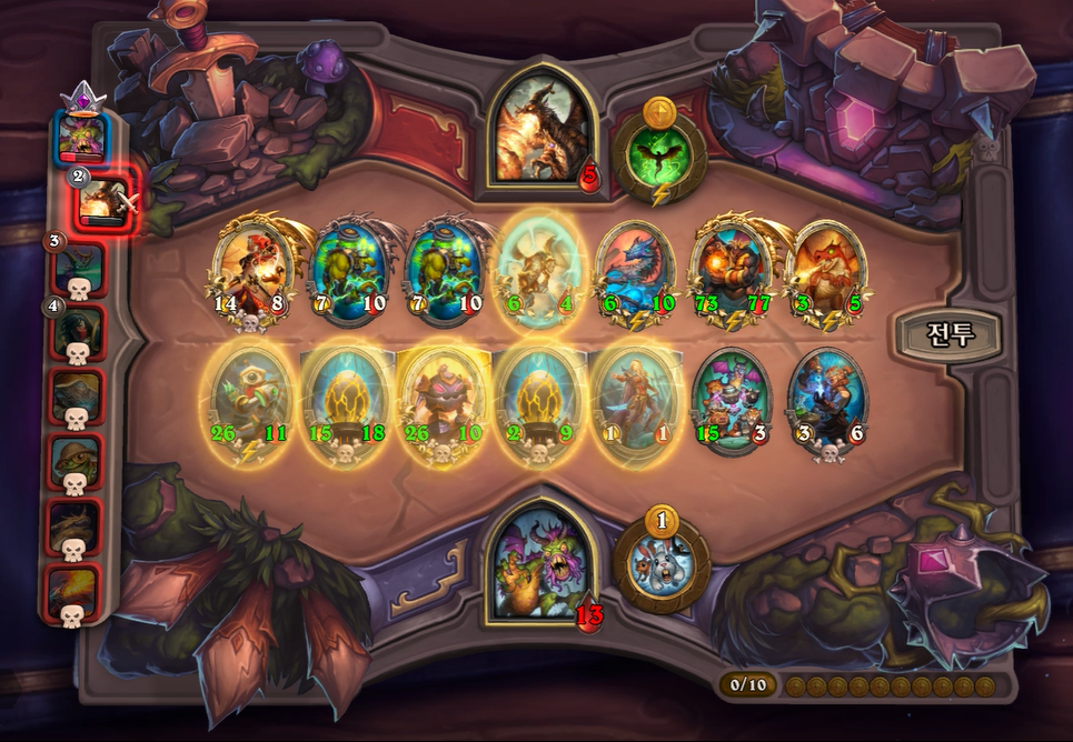 8턴 전투는 기계알과 증식이 리필도 있고, 전반적으로 제 하수인 공격력이 높아 무난하게 이겼습니다. 다만, 상대는 브란이 있어 빨리 처치하지 않으면 1등 덱을 할 것 같았습니다.