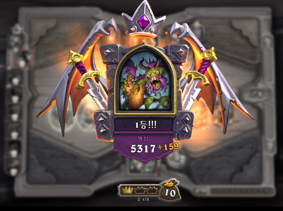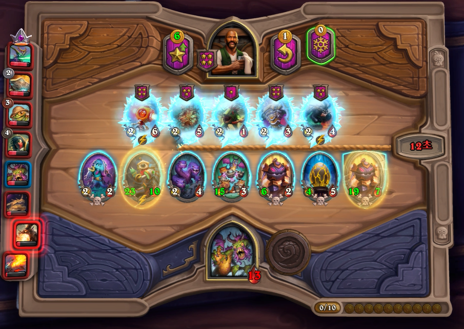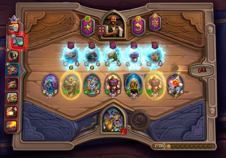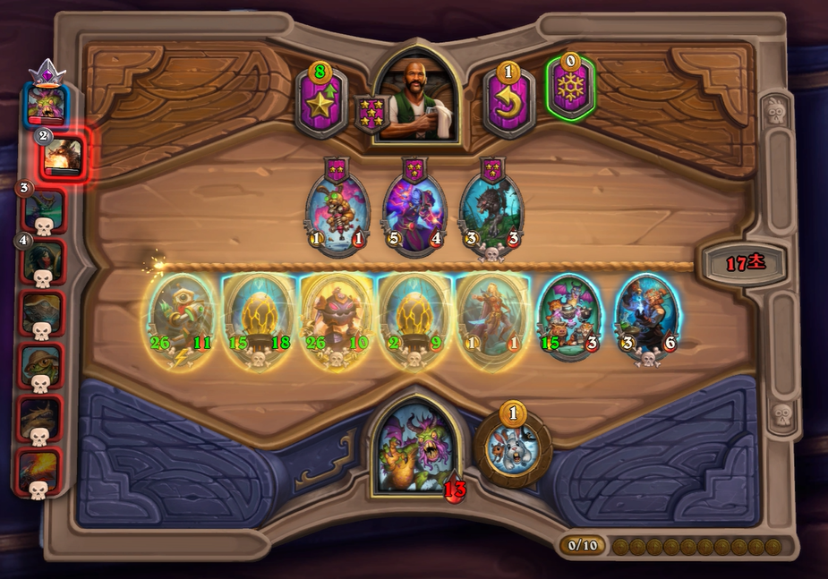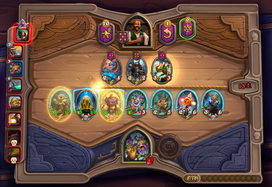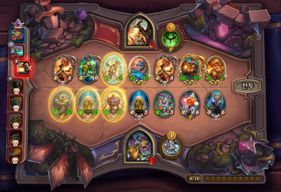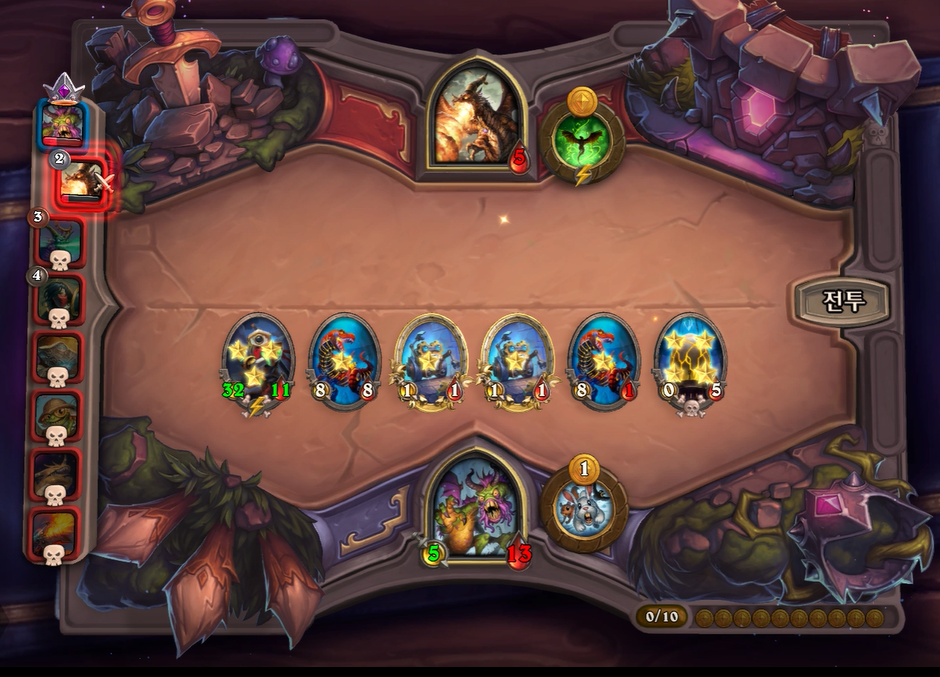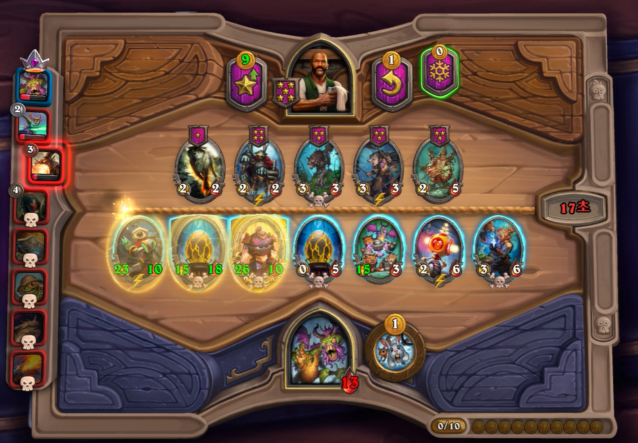 9턴 전투는 충분히 이길만 했는데, 증식하는 위협 차이로 패배했습니다. 상대가 이번턴에 황금카드를 2개나 만들어서 매우 쎄졌습니다. 그래도 전시관리인은 중후반 넘어가면 힘이 확빠지고, 두억시니는 계속 성장할 수 있어 장기적으로는 제가 좀더 좋다고 생각했습니다. 개인적으로 전시관리인을 좋아하는데, 순방하기 생각보다 어렵습니다. 중후반부터는 남들보다 한템포 빠르게 성장해야하는데, 한정된 골드에서 융합체 버프를 주다보면 템포가 느려져 5,6등하는 경우가 저 개인적으로는 많았습니다.