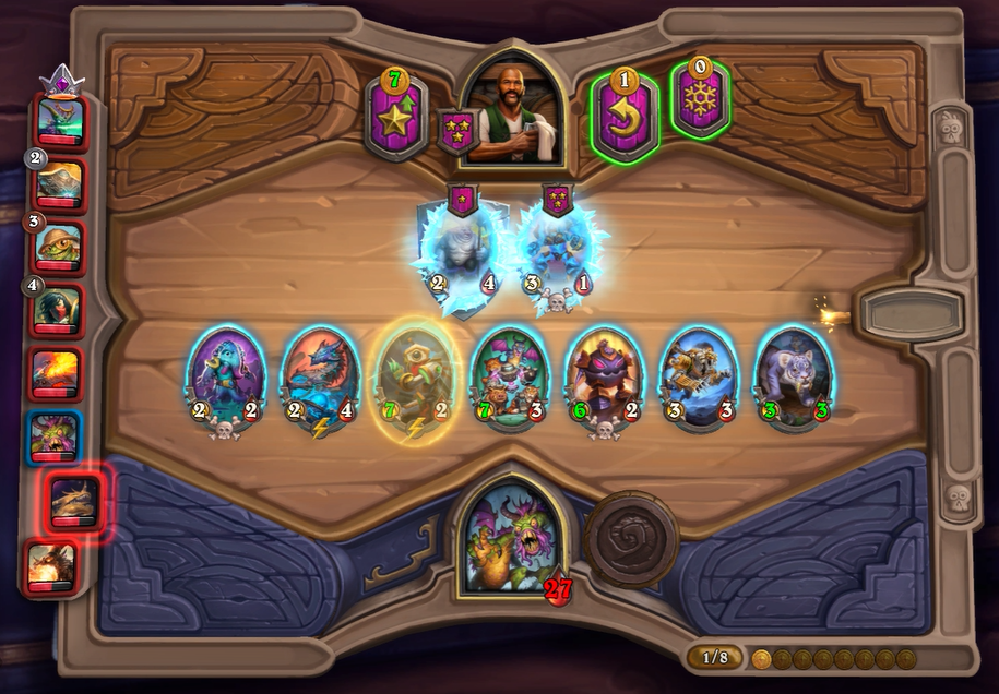 7턴 하수인 상점입니다. 강철니 표범 로봇이 하나더 나왔기 때문에 4레벨을 찍고, 영능 + 표범을 통해 다시 한번 전체 기계 하수인에게 공격력 +4를 주었습니다. 이제부터는 필드를 채워서 선공을 가지는 쪽이 유리하기 합니다. 만약 증식하는 위협을 사면 필드를 한자리 비워야하고, 영웅 능력도 못쓰기 때문에 최대한의 이득을 보기 위해 이러한 플레이를 했습니다.