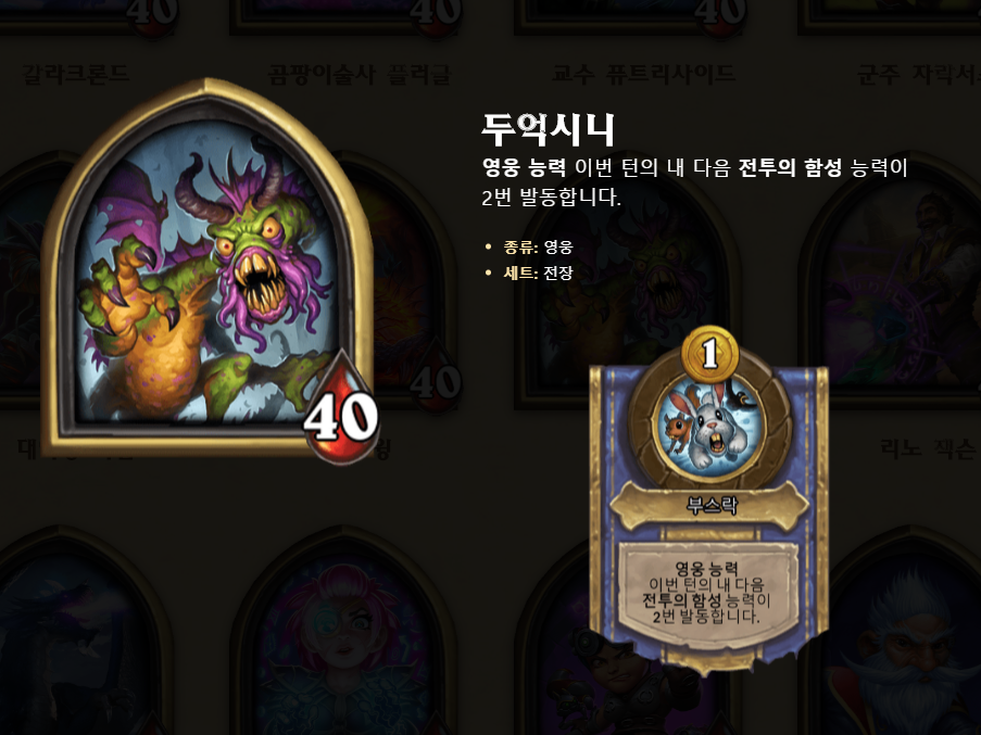 일반적으로 두억시니는 특정덱에 얽매이는 영웅은 아니지만, 빛송공니 덱, 멀록덱 같이 버프 시너지를 내서 필드를 강화하는 플레이를 구사하시면 됩니다. 이번 덱은 오랜만에 순수 기계 버프덱으로 아메리카 서버에서 1위를 했던 것으로 리뷰를 작성했습니다.(가급적 아시아 서버로 포스팅하고 싶은 마음이 굴뚝이나, 대부분 S 혹은 A급 영웅을 하다 보니 포스팅각이 잘 안나오네요ㅎㅎ;)참고로 두억시니는 제 기준으로 현재 티어는 B급 하위권 정도로 생각합니다. 영웅능력을 쓰기도 전에 죽는 경우가 많아서 그렇게 추천하는 영웅은 아닙니다!