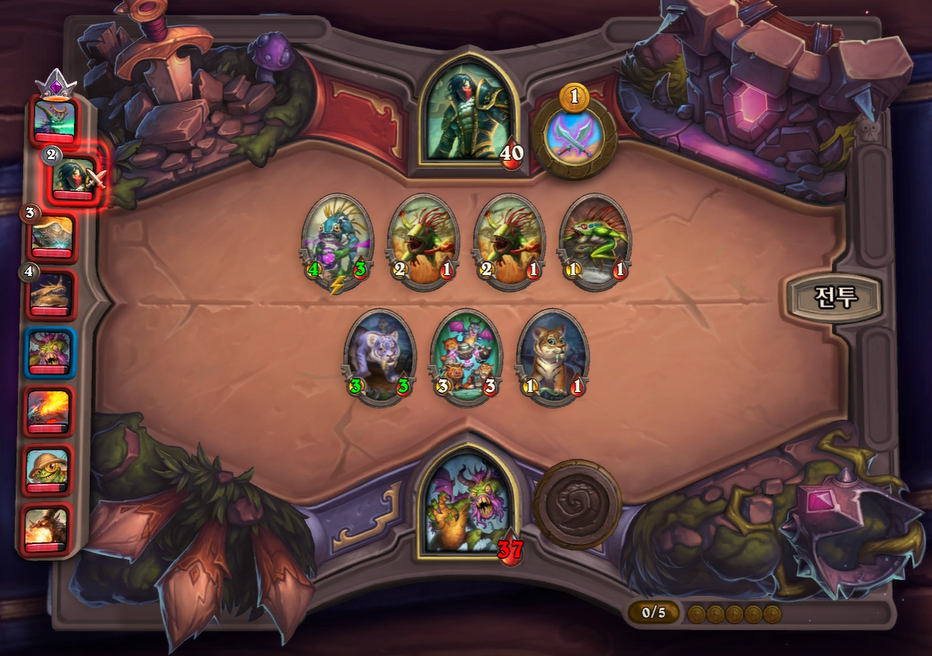 5턴 전투는 상대가 이득 교환도 잘했고, 필드도 꽤 쎘기 때문에 패배했네요. 아직은 두억시니 영웅 능력을 활용하기 힘들다 보니 전투에서 밀릴수 밖에 없습니다.