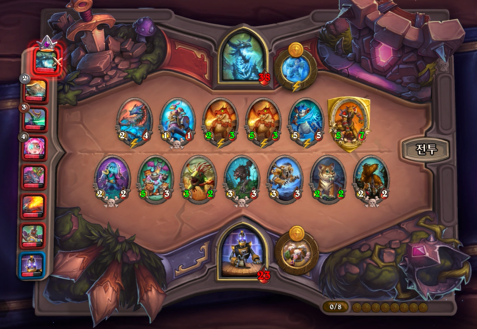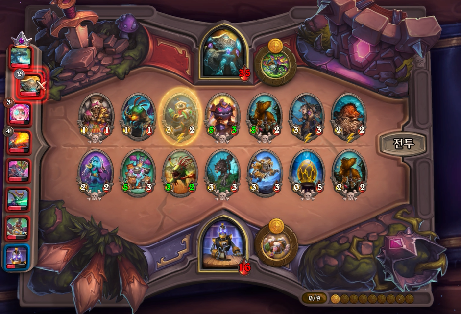 15턴 전투는 다행히도 제가 이겼습니다! 상대가 도발을 가운데 배치한 덕에 히드라가 천보를 전부 벗기면서 할만 했네요ㅎㅎ; 이외에 전투 및 하수인 상점은 계속 성장형이기에 마지막 상점 및 전투에 대해서만 쓰겠습니다.
