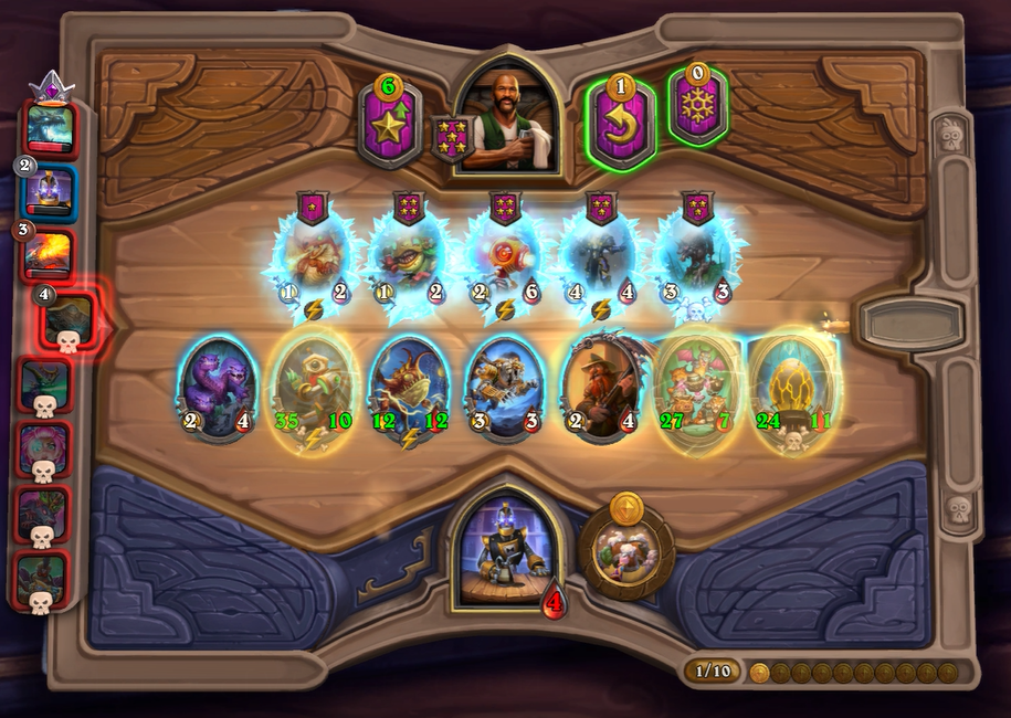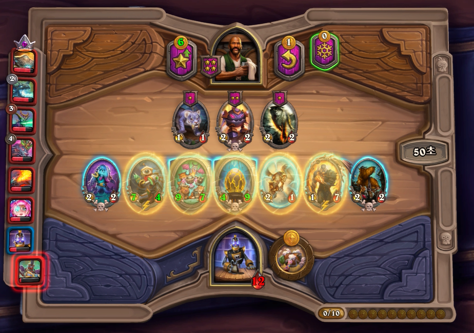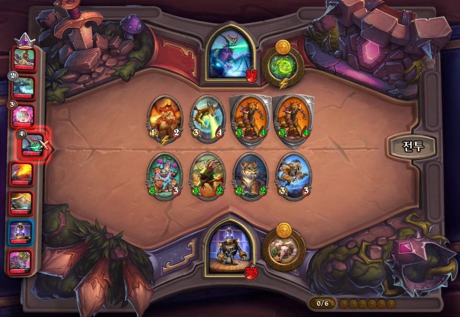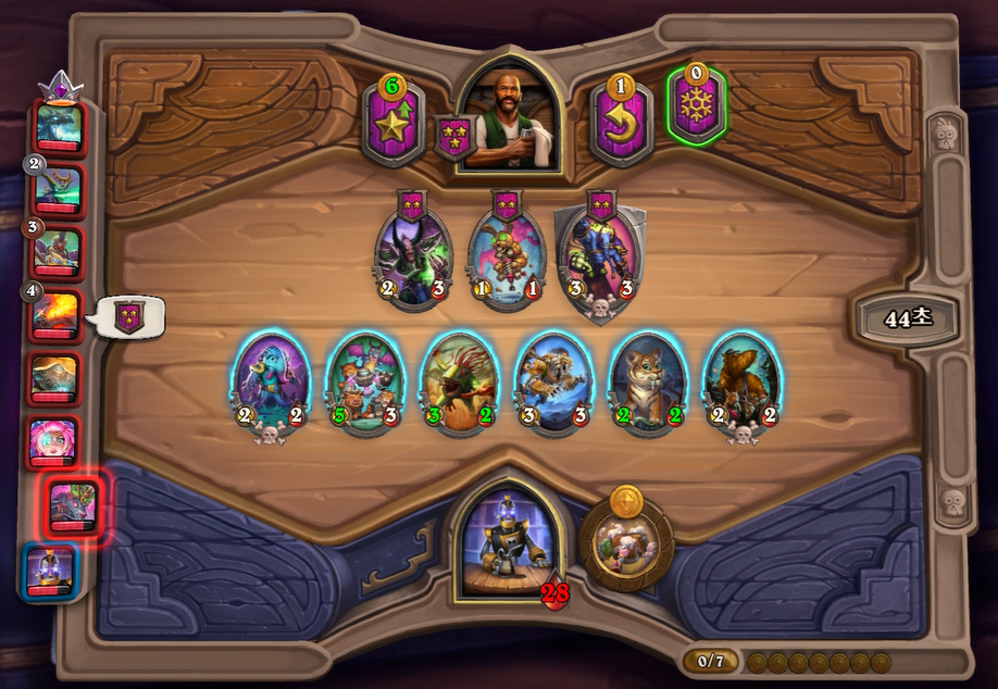 6턴 하수인 상점입니다. 4레벨을 찍을까 고민했는데, 필드가 너무 약하기 때문에 하수인을 좀 더 찾아보았습니다. 하지만 아쉽게도 근본 하수인들이 너무 안나와서 이번 턴에 꼴찌할 줄 알았습니다.