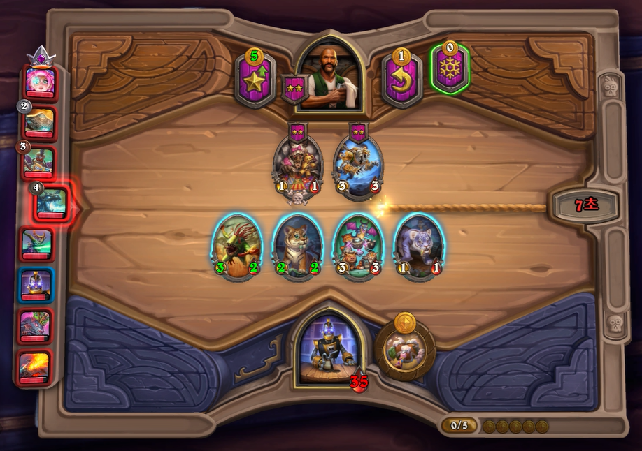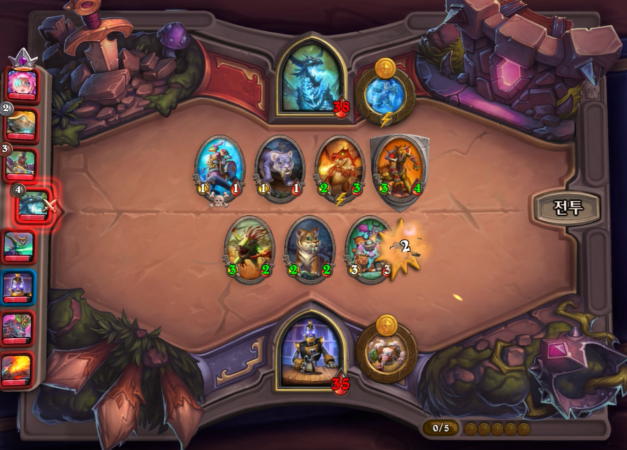 5턴 하수인 상점입니다. 빠른 3레벨을 찍었음에도 선택지가 2성 하수인 밖에 없었네요... 이렇듯 빠른 레벨업을 했음에도 하수인 운이 없으면 매우 힘듭니다.