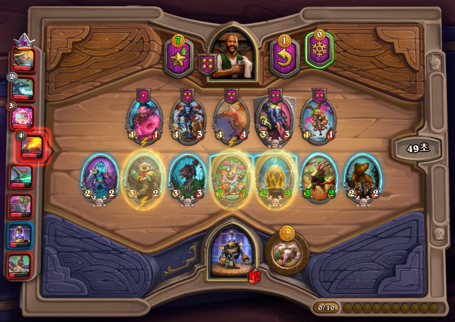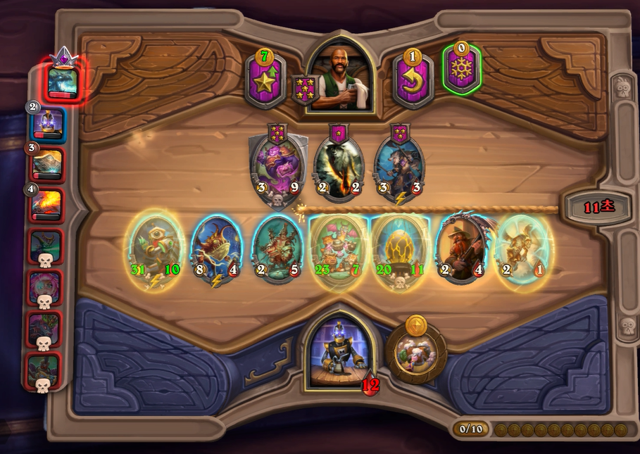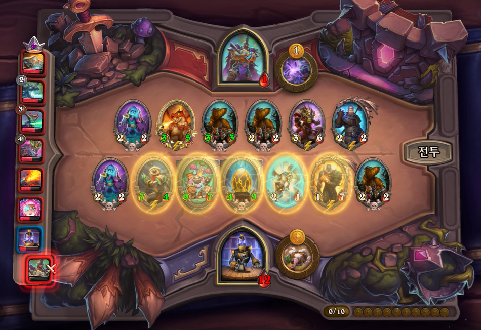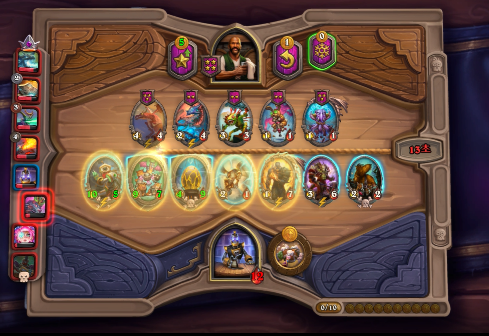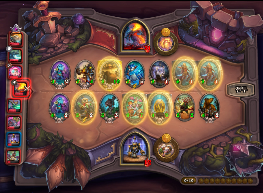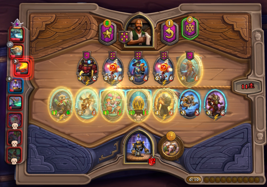 10턴 하수인 상점입니다. 마찬가지로 버프를 계속 발라주었고, 용기병 집행자를 느조스 대신 넣어주었습니다. 느조스보다는 지금 타이밍 부터는 전투 하수인을 하나더 넣는 것이 좀 더 좋기때문에 느조스는 황금 카드각이 나오지 않으면 버려주시는게 좋습니다. 그리고 5레벨은 체력 여유가 없었고, 특별히 찾을 게 없어 찍지 않았습니다.