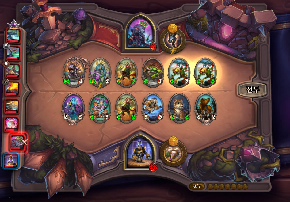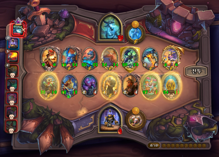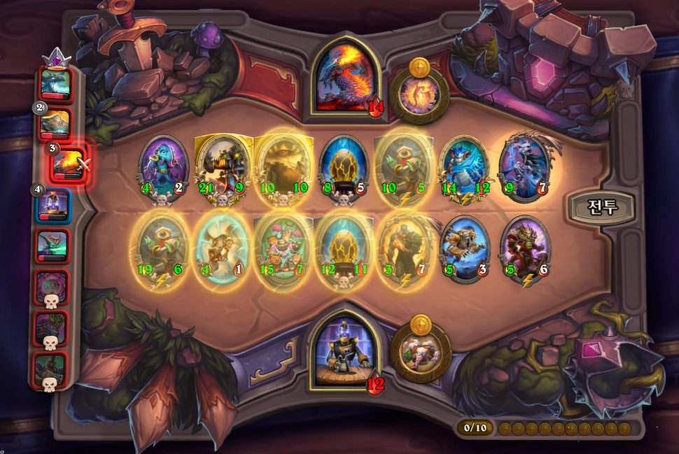 13턴 전투는 상대가 용덱 완성을 했기때문에 완패를 했습니다. 그나마 칼렉고스를 잡아서 체력 4로 생존했습니다. 그래도 브란 버프로 성장은 저도 뒤쳐지지 않기 때문에 3턴정도만 버티면 할만하다는 생각으로 버프를 찾아야했습니다.