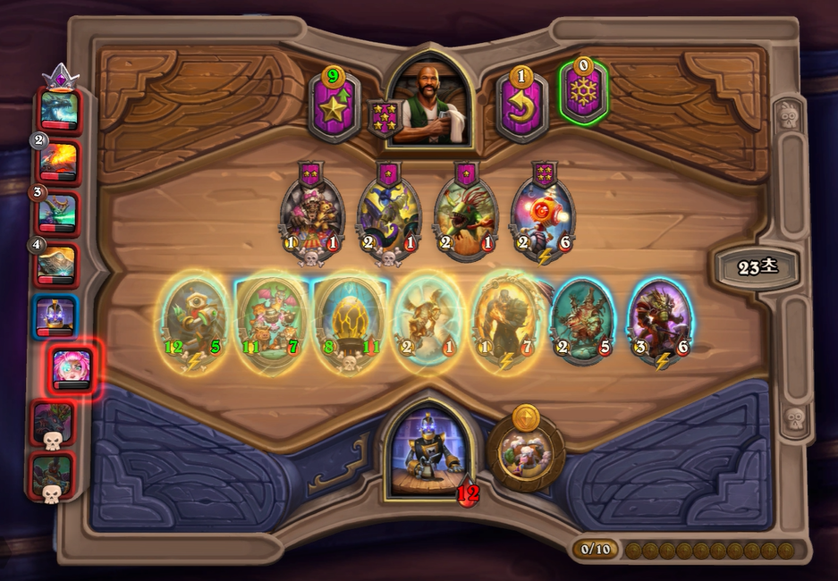 9턴 하수인 상점입니다. 버프 하수인들을 찾아주었고, 볼바르와 청동감시자를 필드에 넣었습니다. 8턴 타이밍에 이정도 필드면 꽤나 강력한 편이기에 꼴찌한테는 이기지 않을까 생각했습니다.