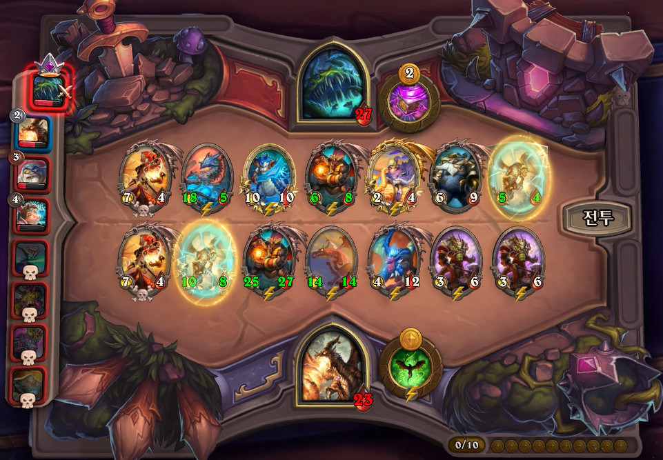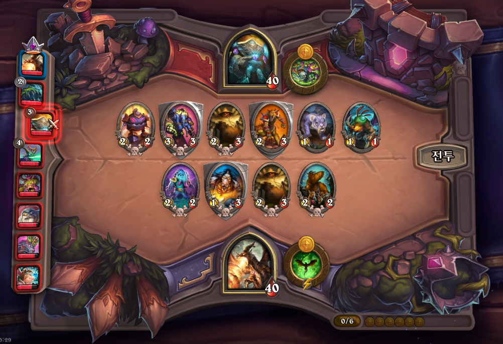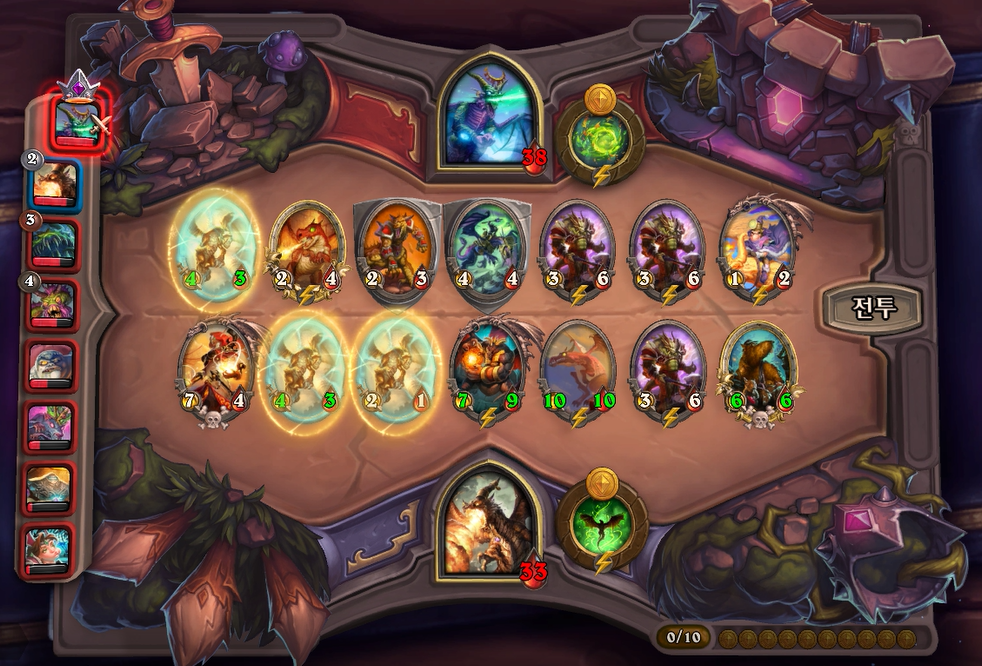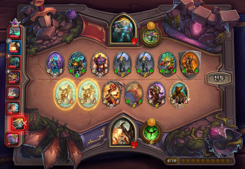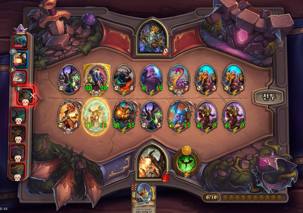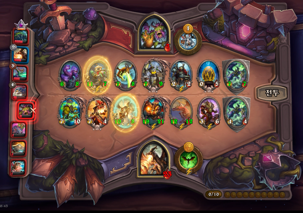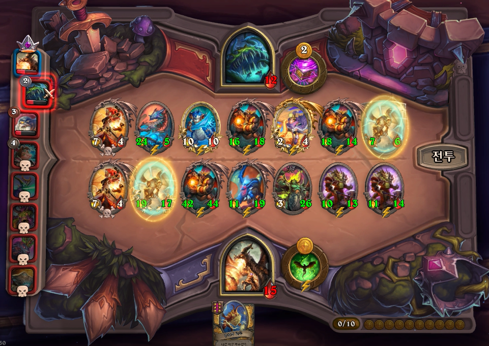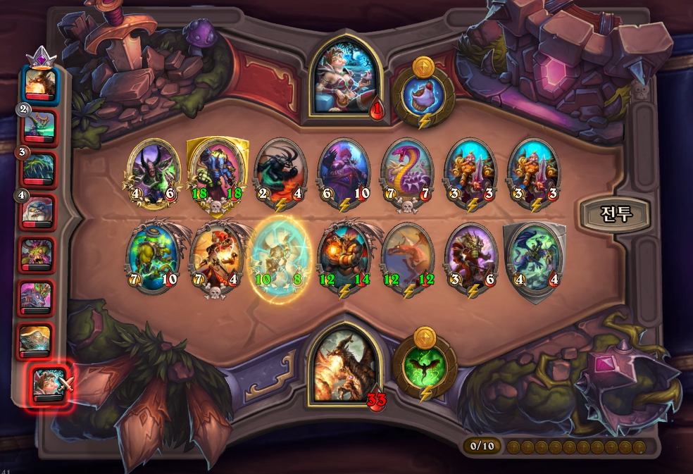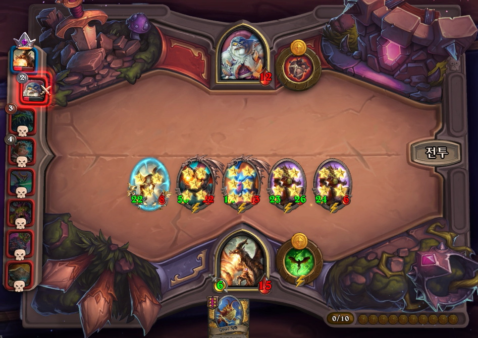 10턴 전투는 아쉽게 곡예사 1개를 못끊었고, 임프두목에서 공허군주가 나와 10데미지나 맞았습니다. 상대가 6성 하수인이 2개나 있어 쉽지 않았습니다.