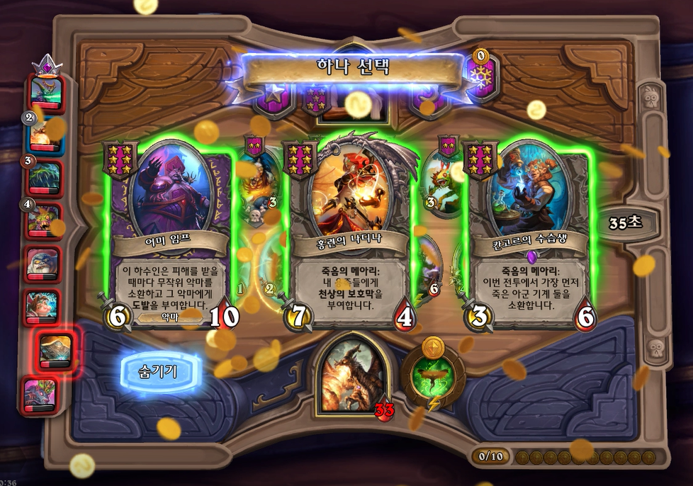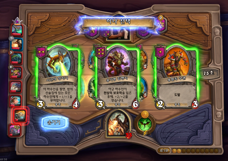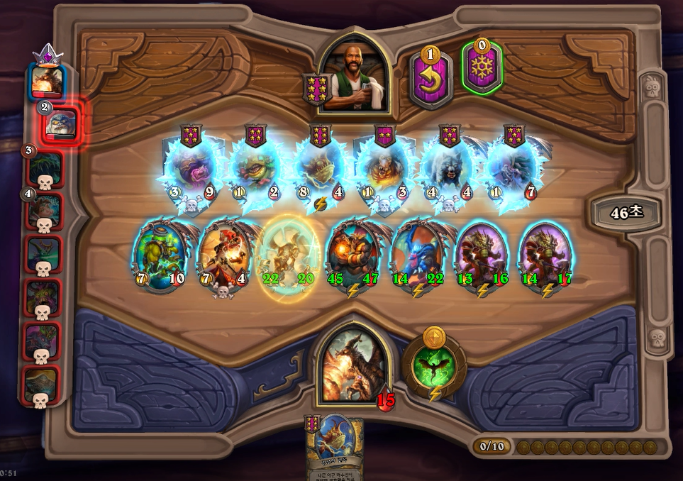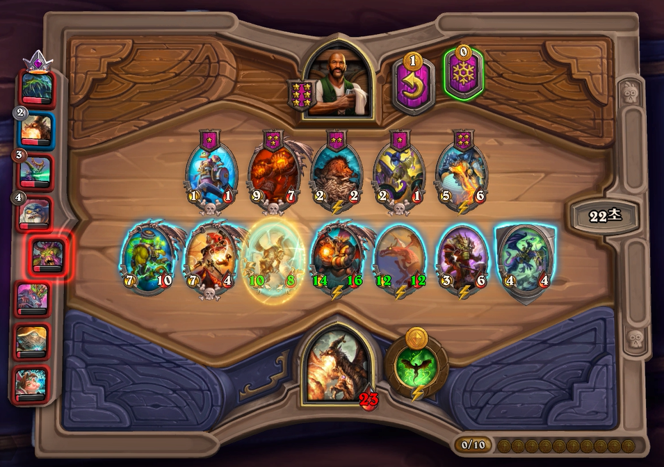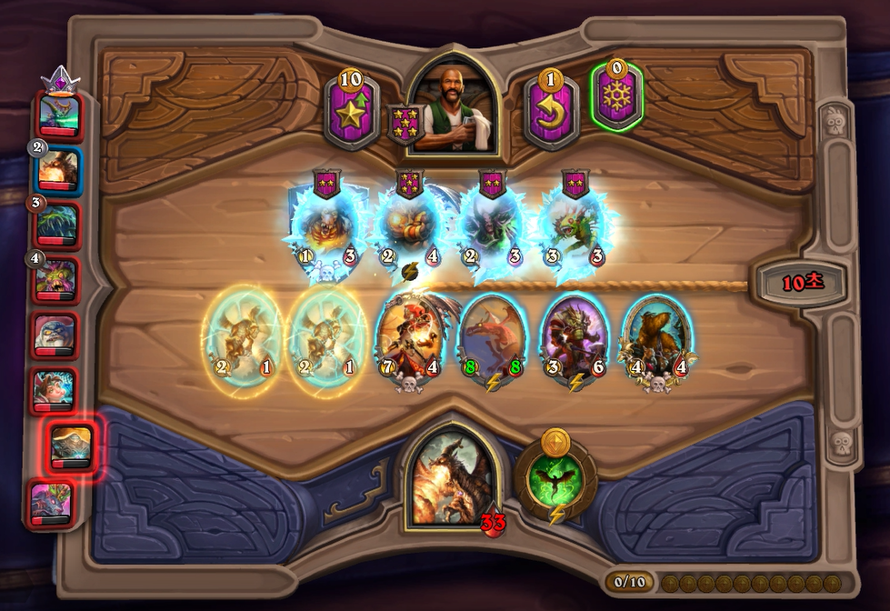 10턴 하수인 상점입니다. 황금 청동감시자를 만들었는데, 아쉽게도 칼렉고스가 뜨지 않았네요. 그나마 상대가 슈팅악마로 예상해서 잽을 선택했습니다.
