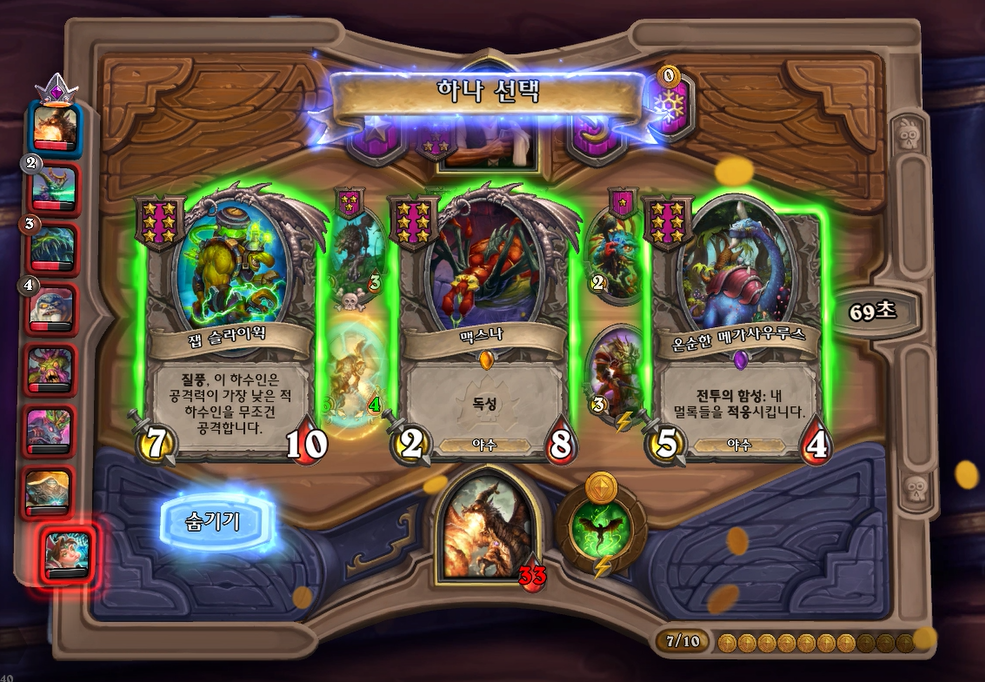 3턴 하수인 상점입니다. 정의로운 수호자를 팔고, 허수아비 골렘과 쥐떼를 구입했습니다. 최대한 알렉스트라자는 5레벨까지 체력관리를 하는 것이 매우 중요합니다. 5레벨을 찍어 칼렉고스를 찾았어도 체력이 10 이하로 남았을때 굉장히 리스크가 크기 때문에 그전까지 필드를 강한 하수인들로 채워야합니다!