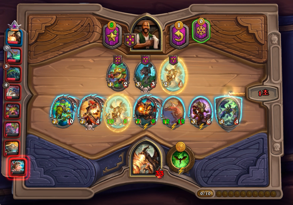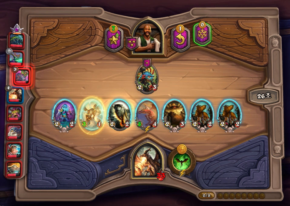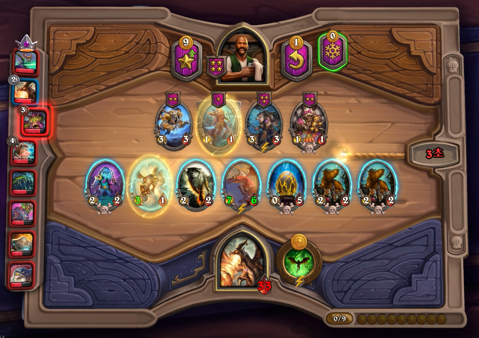 8턴 하수인 상점입니다. 발견 1을 통해 용기병 집행자, 발견2를 통해 청동감시자를 구입했습니다. 이렇게 5성 발견이 망했지만, 황금 쥐떼를 통해 다행히 나디나를 찾았습니다. 그래도 필드가 약한건 어쩔수 없지만, 체력이 33이나 남아있고, 다음 턴에 폭군 서슬송곳니를 구매할 수 있어 성장 기대치가 높은 상태입니다.