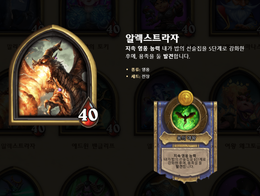 알렉스트라자의 영웅 능력은 5레벨을 찍으면 무작위 용족 둘을 발견합니다. 사실상 AFK의 반대의 경우로, 후반을 도모할 수 있는 영웅 능력입니다. 5 레벨 전까지 체력관리를 하여 5 레벨 때 폭발적인 힘을 발휘할 수 있죠. 보통 5 레벨 전까지 대깨용을 할 필요 없고, 필드만 세게 잡고, 5 레벨부터 용덱을 맞춰는 운영이 좋습니다. 사실상 5렙 전까지는 패치워크 이기때문에 강한 하수인을 구매해서 센 필드를 유지하는 것이 좋습니다.