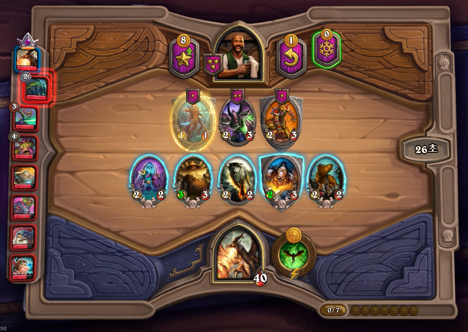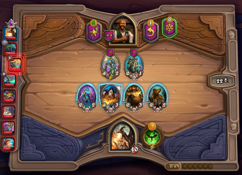 1턴 하수인 상점입니다. 그나마 무난한 정의로운 수호자를 구매했습니다. 상대가 AFK이기에 승리했고, 2턴은 국룰 레벨업이기 때문에 생략하겠습니다.