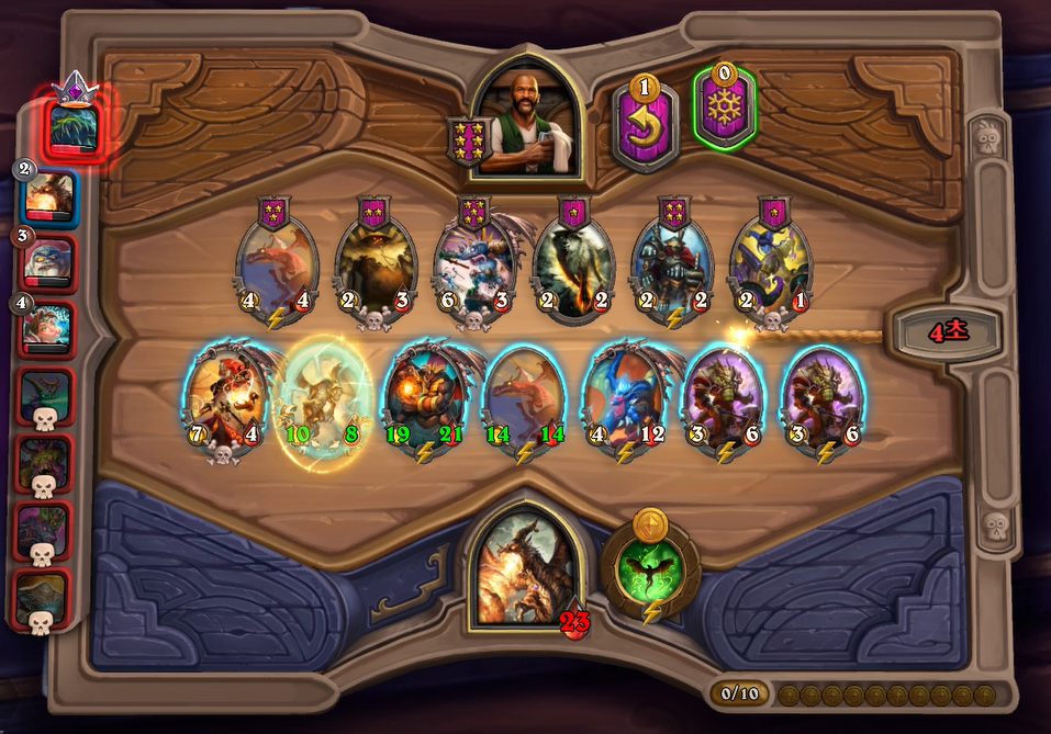 알렉은 이처럼 장단점의 극차가 굉장히 크다보니 A급을 주기에는 조금 무리가 있습니다. 특히 점수가 8,9000점 이상이신 분들은 공감하시겠지만, 워낙 초중반 템포가 빠르다보니 알렉, 리노잭슨, 플러글같은 후반 영웅들이 살아남기 정말 힘듭니다. 상점 운이 정말 좋고, 발견 또한 괜찮아야하죠. 이번 플레이 리뷰는 아메리카 서버에서 진행했고, 용덱으로 우승했습니다. 비록 5렙 발견으로 칼렉고스가 뜨지 않았지만, 빠르게 6레벨을 찍고, 칼렉고스를 찾아 간신히 우승할 수 있었습니다. 그럼 본격적인 리뷰 시작하겠습니다.