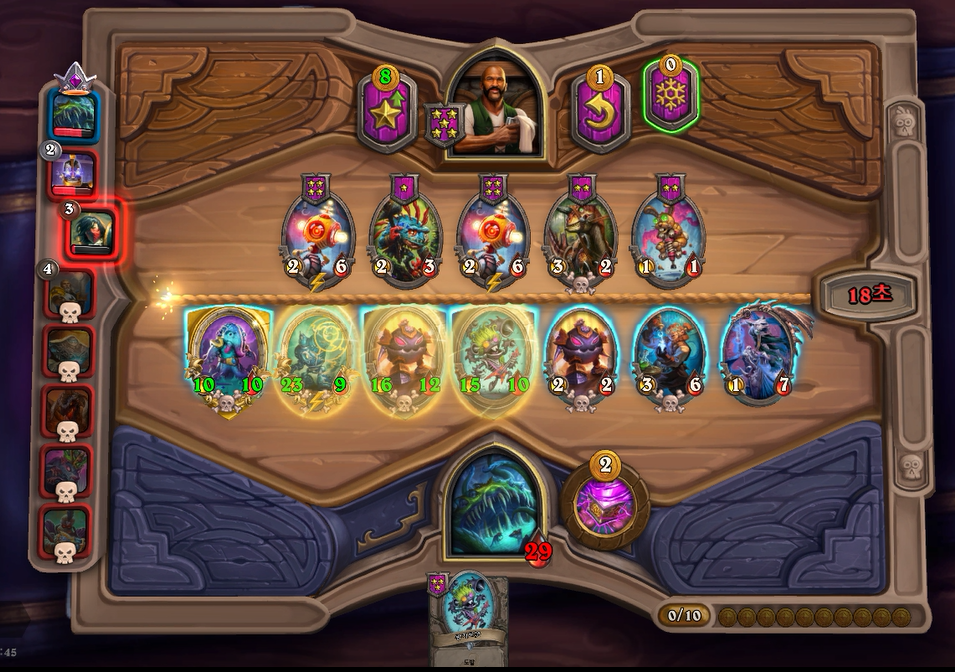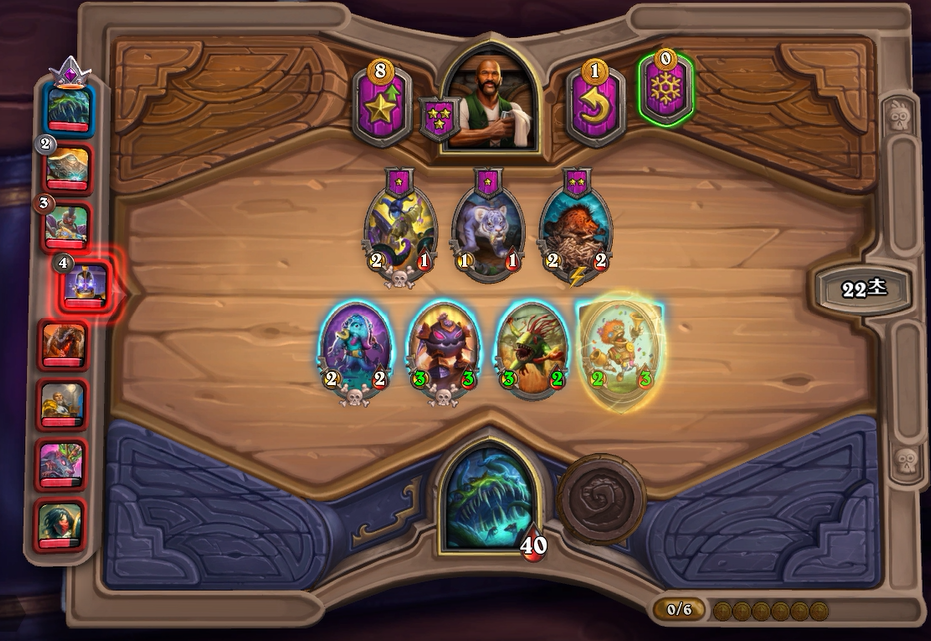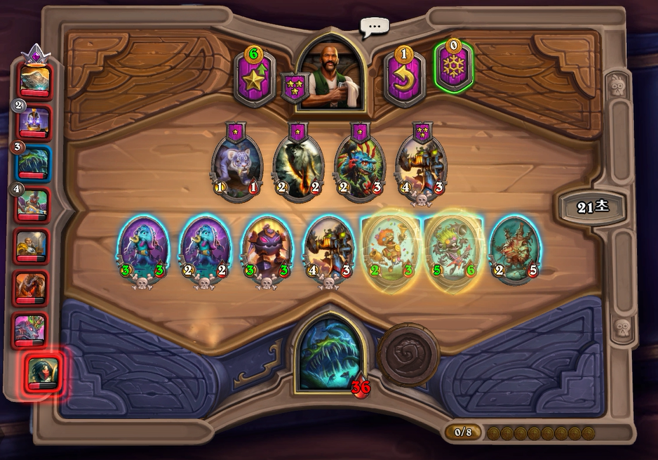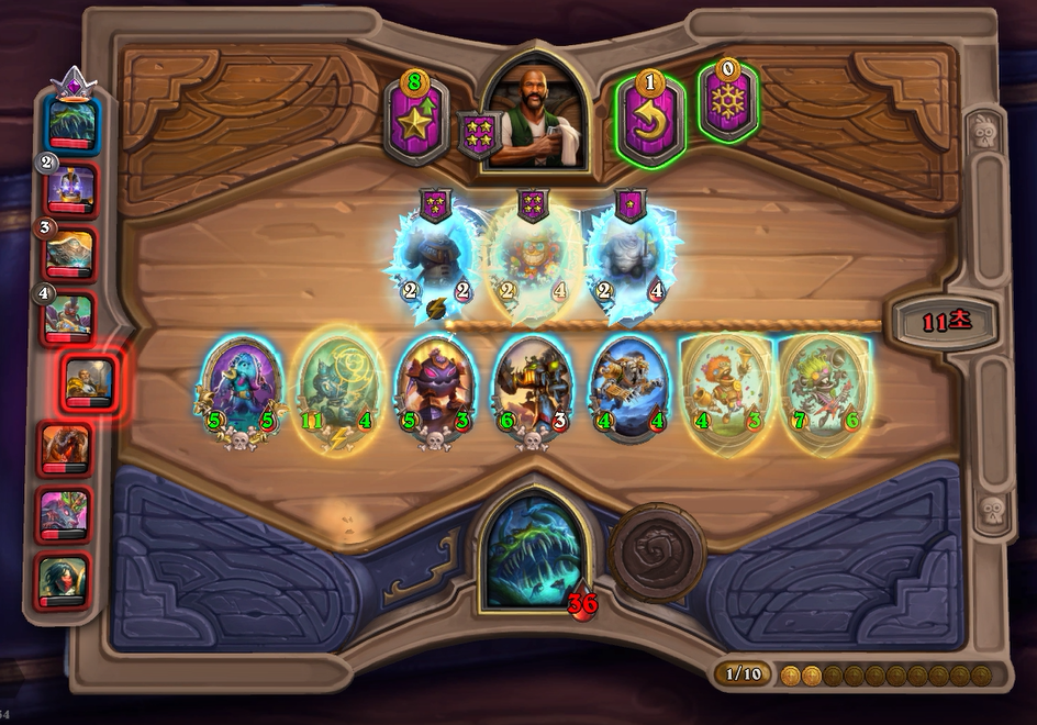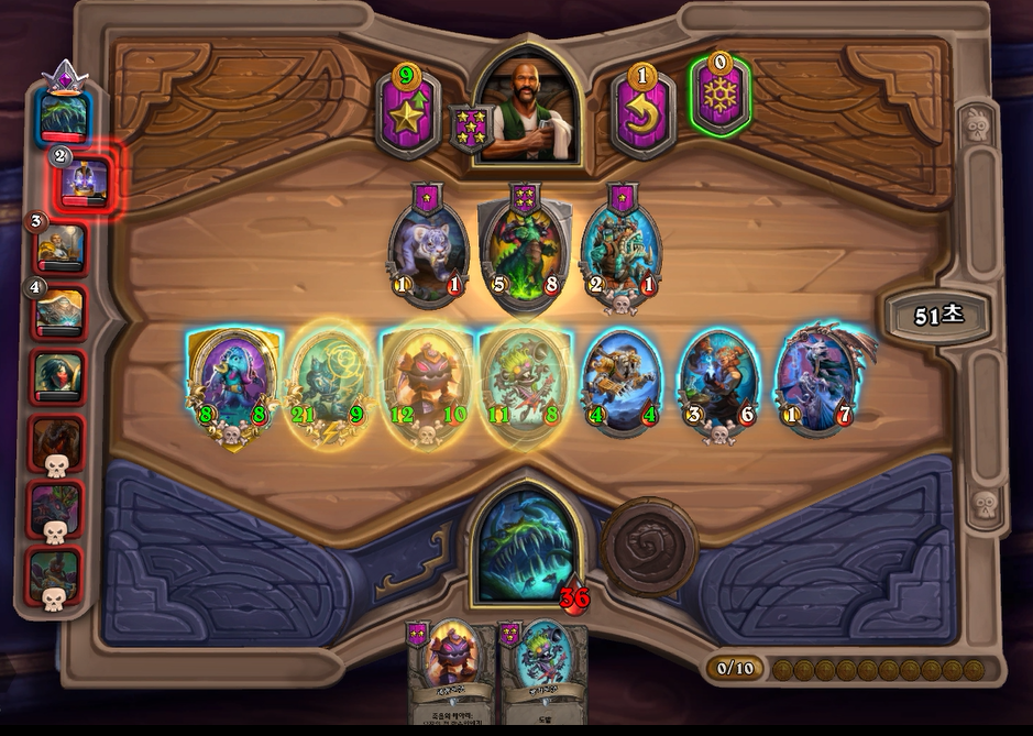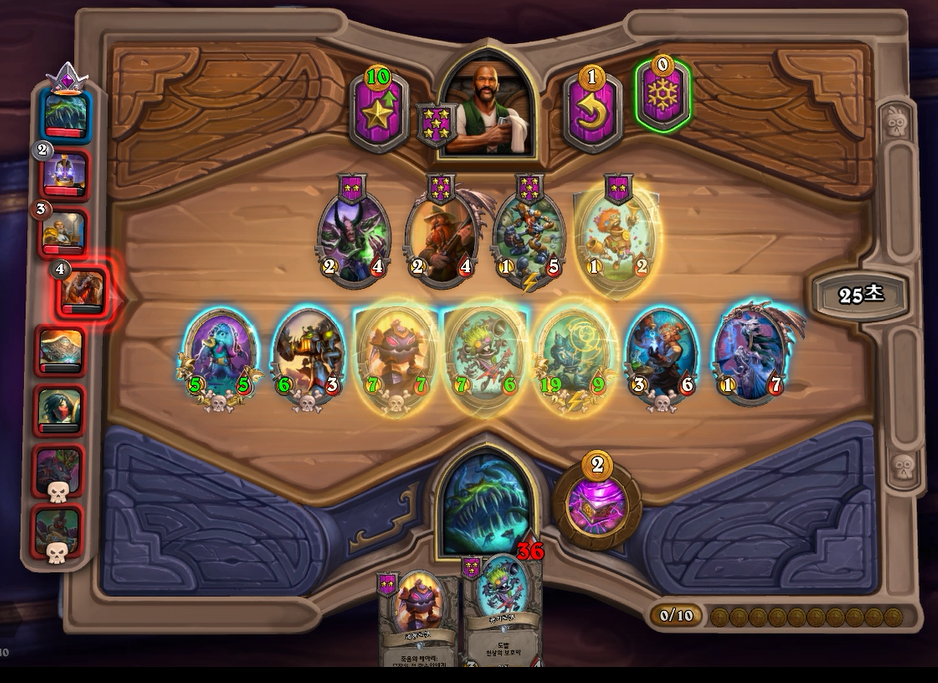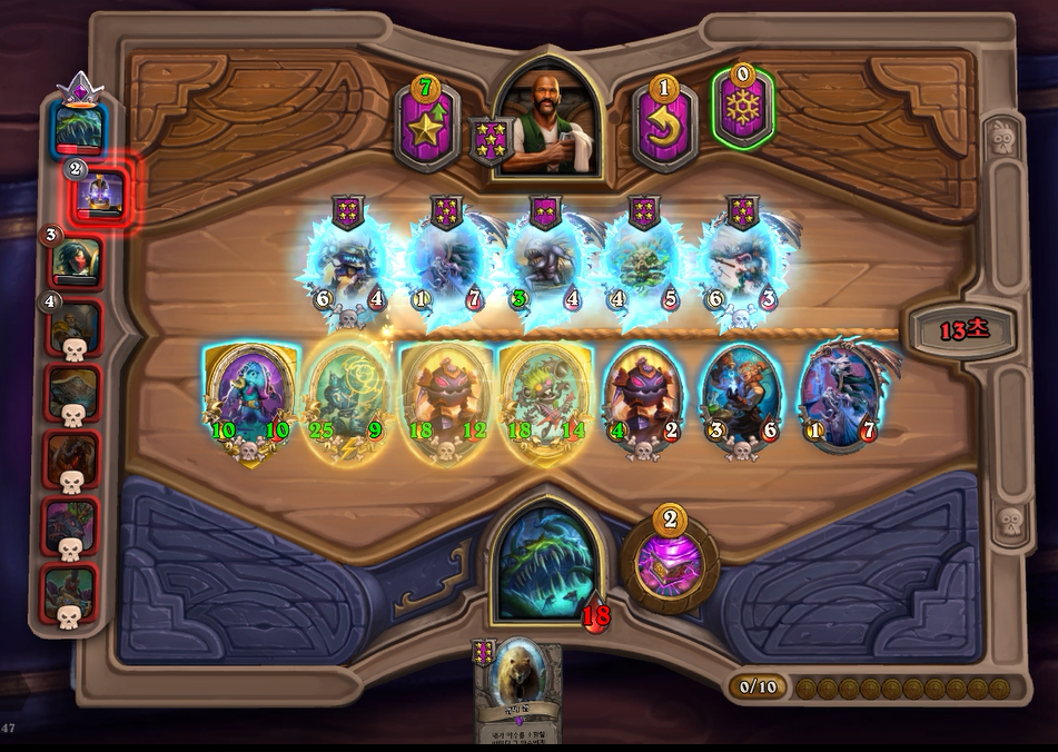 7턴(9코스트) 상점에서 바로 느조스의 피조물이 떳네요! 이럴때는 레벨업을 해서 5성 발견으로 리븐데어를 찾아보는 것이 좋습니다. 하지만 5성 발견은 종류가 많아 확률이 낮다는 점을 간과해서는 안되겠네요.. 그나마 스탯이 좋은 사바나 사자를 구매했습니다. 느조스의 피조물만 죽으면 전체 +12/+12 버프이기 때문에 무난히 이길수 있습니다. 이번에는 느조스의 피조물이 바로 죽지 않았지만 필드가 쎄서 간신히 이길수 있었습니다.