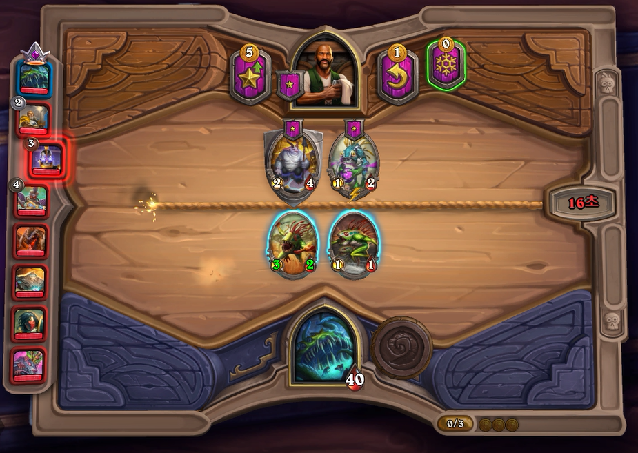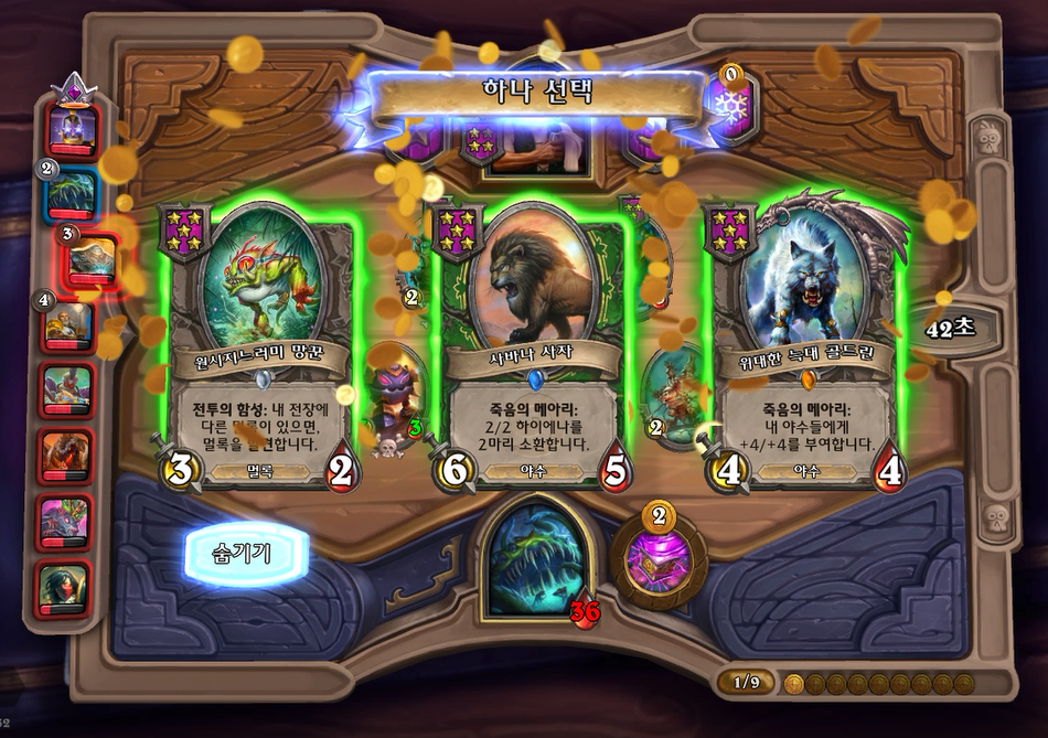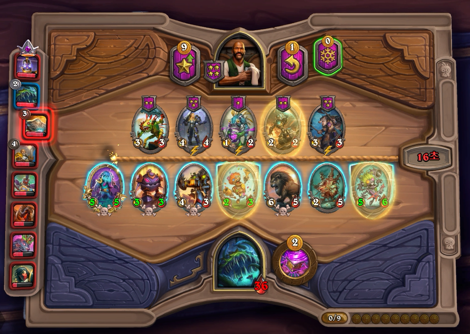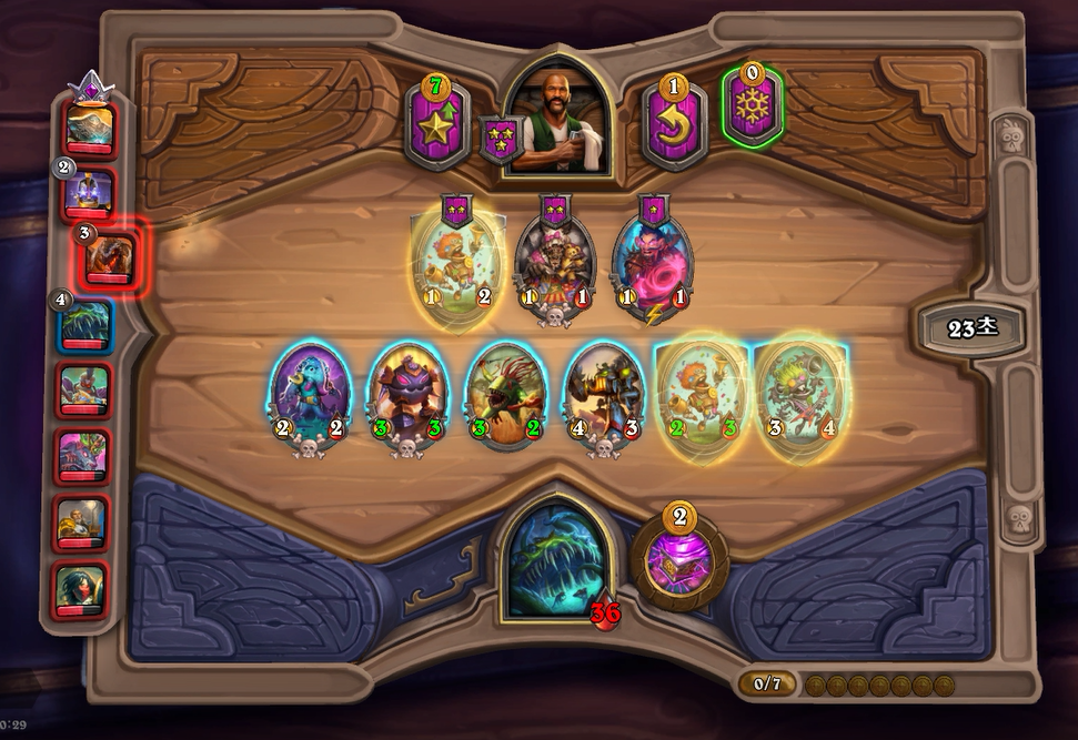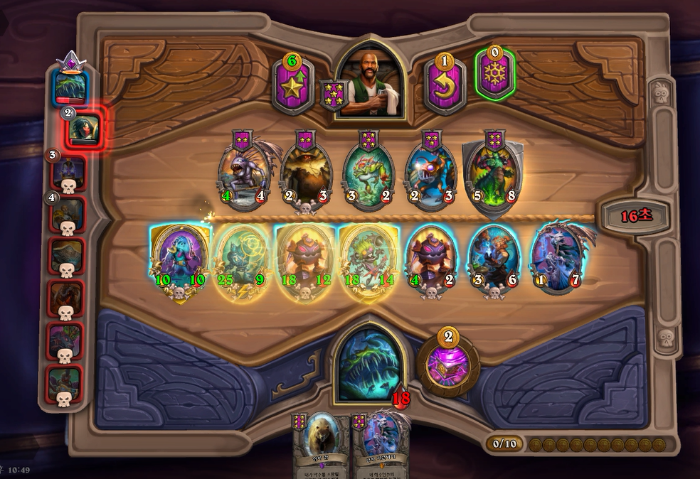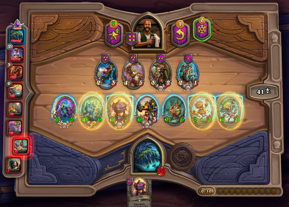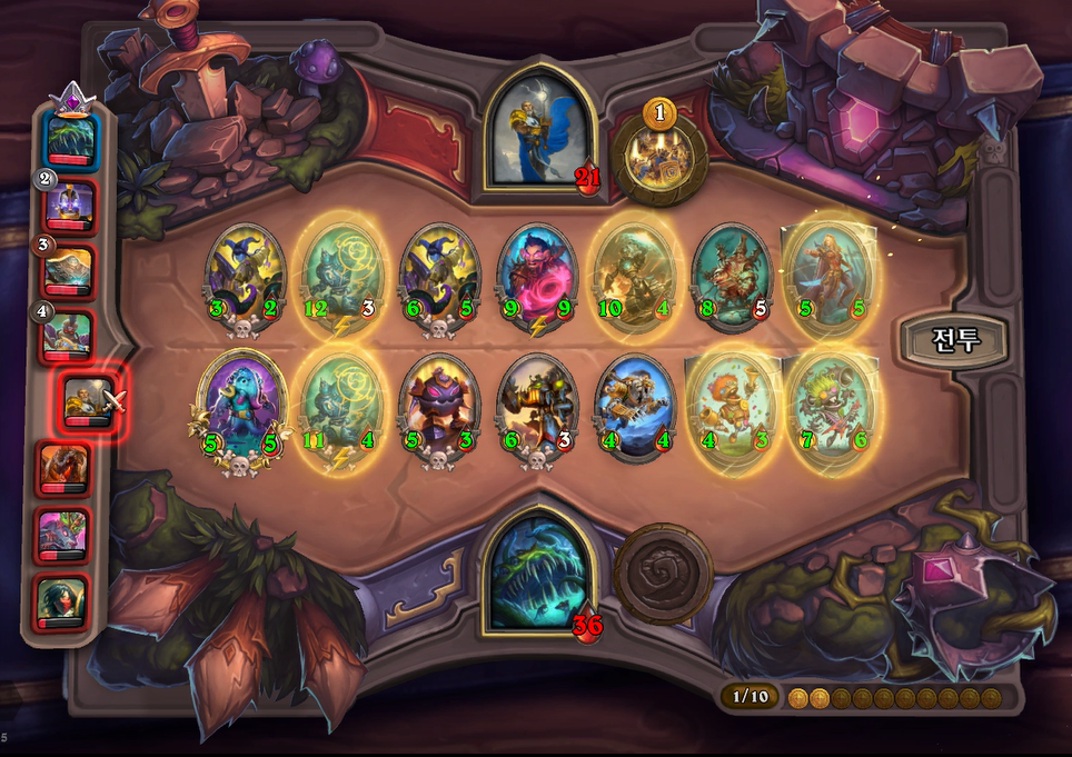 7턴(9코스트) 상점에서 바로 느조스의 피조물이 떳네요! 이럴때는 레벨업을 해서 5성 발견으로 리븐데어를 찾아보는 것이 좋습니다. 하지만 5성 발견은 종류가 많아 확률이 낮다는 점을 간과해서는 안되겠네요.. 그나마 스탯이 좋은 사바나 사자를 구매했습니다. 느조스의 피조물만 죽으면 전체 +12/+12 버프이기 때문에 무난히 이길수 있습니다. 이번에는 느조스의 피조물이 바로 죽지 않았지만 필드가 쎄서 간신히 이길수 있었습니다.
