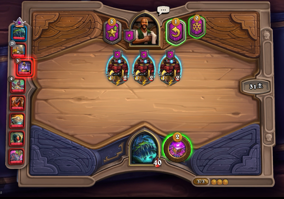 3턴(5코스트) 하수인 상점입니다. 4개의 하수인 모두 2성 하수인들중 S급이 나왔네요ㅎㅎ. 느조스의 하수인 같은경우 먼적 죽어야하기때문에, 먼저 구매를 하고 영웅능력을 사용했습니다. 뭘 가져와도 좋았는데, 콰광로봇이 뽑혔네요. 이렇게 되면 기계덱을 가는것이 좋다고 판단해서 얼리지 않았습니다. 상대는 강력한 티리온 폴드링이었지만, 토큰하나차이로 이겼습니다.