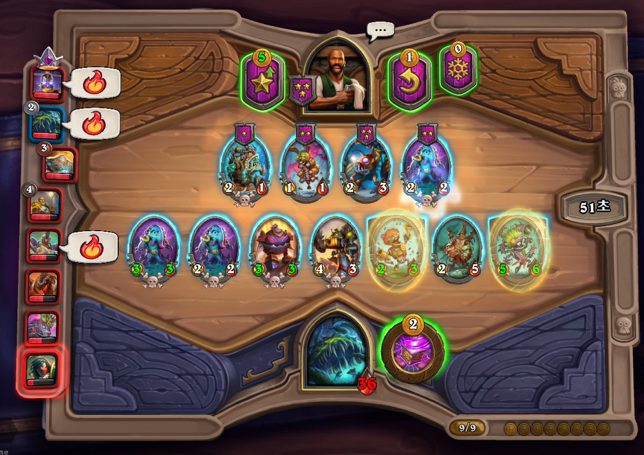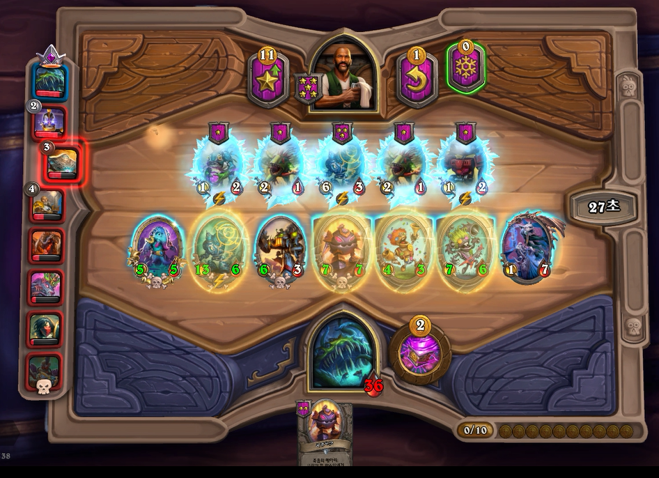 이번에는 5레벨을 찍고 리븐데어을 찾았습니다. 체력이 36이기 때문에 5렙을 찍을 타이밍이 나왔습니다. 덤으로 리롤했더니 코발트도 나왔네요. 이 코발트도 콰광이 처럼 바로내지는 않고, 페어용으로 사놓을 생각입니다. 리필수단이 현재는 벌목기밖에 없기 때문에 기계알을 얼른 찾아야 했습니다. 물론 황금 느조스+리븐데어면 전체 +4/+4 버프이기 때문에 매우 강력한 필드입니다. 상대를 가볍게 제압했습니다.