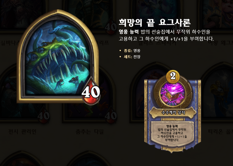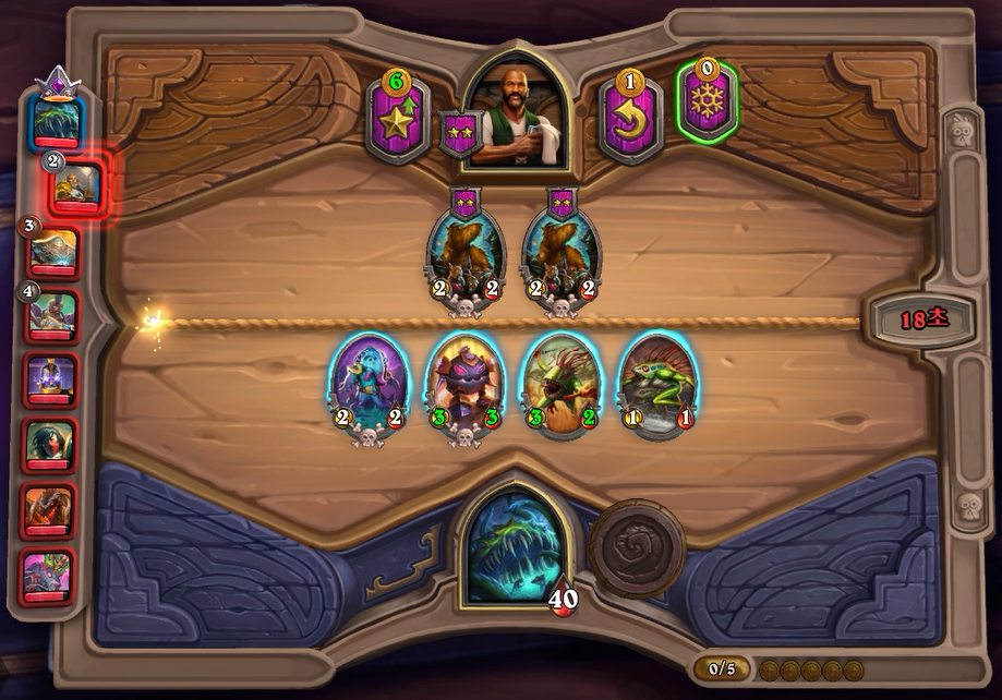 요그샤론의 영웅능력은 2코스트로 하수인을 살수 있고, 그 하수인에게+1/+1을 부여하기 때문에 초반부터 후반까지 코스트 이득을 많이 볼수 있습니다. 특히 가장 빛을 발하는 타이밍이 3턴(5코스트)입니다. 설명 1턴에 토큰시작을 못했어도 3턴에 영웅능력+하수인구매가 가능하기 때문에 3턴에 필드가 가장 쎈 영웅이라고 생각합니다. 이를 바탕으로 스노우볼을 굴릴수 있어, 개인적인 생각으로 부동의 S급 티어 영웅이라고 생각되네요. 후반가면 영능이 의미없다는 생각을 가질수 있지만, 3~4랩 상점에서 2~3개가 좋은 하수인이면 영웅능력을 써서 코스트 이득을 볼수 있으므로 저는 중후반에도 좋은 영웅이라고 생각합니다. 그리고 1턴에 상점이 아래 사진처럼 정말 안좋다 생각하시면 리롤+ 영능플레이를 하셔도 됩니다. 1턴에 토큰밖에 살게 없어 영웅을 망설이시는 분도 있는데, 무조건 영웅능력을 쓰는게 이득입니다. 1턴 싸움이 체력 1차이로 승패가 갈리기 때문에, +1/+1을 하수인에게 부여하는 영웅능력 플레이를 추천합니다. 그리고 솔직히 요그샤론은 토큰 의존도가 매우 낮기 때문에 1턴에 바위웅덩이 혹은 야비한 소악마를 가져오는데 저는 오히려 좋다고 생각합니다.