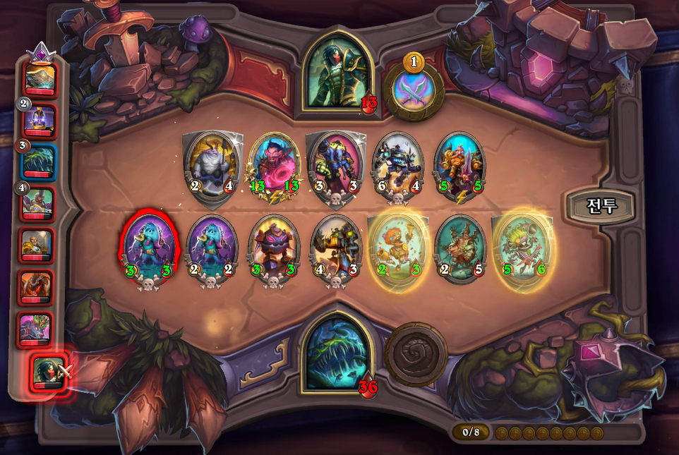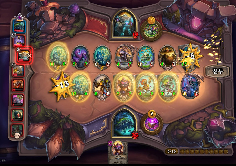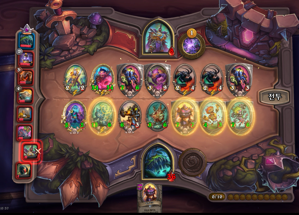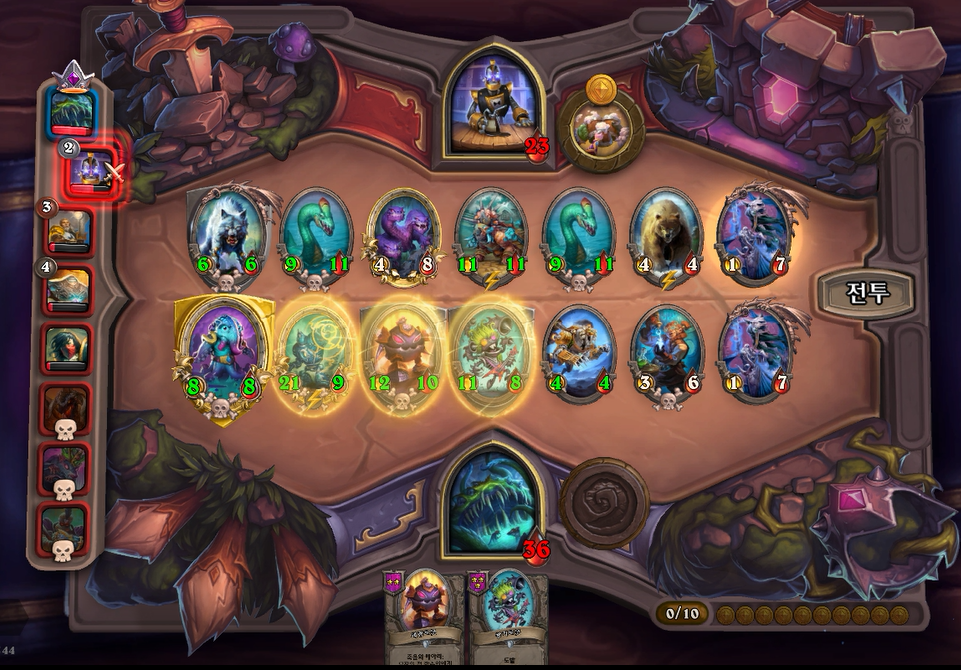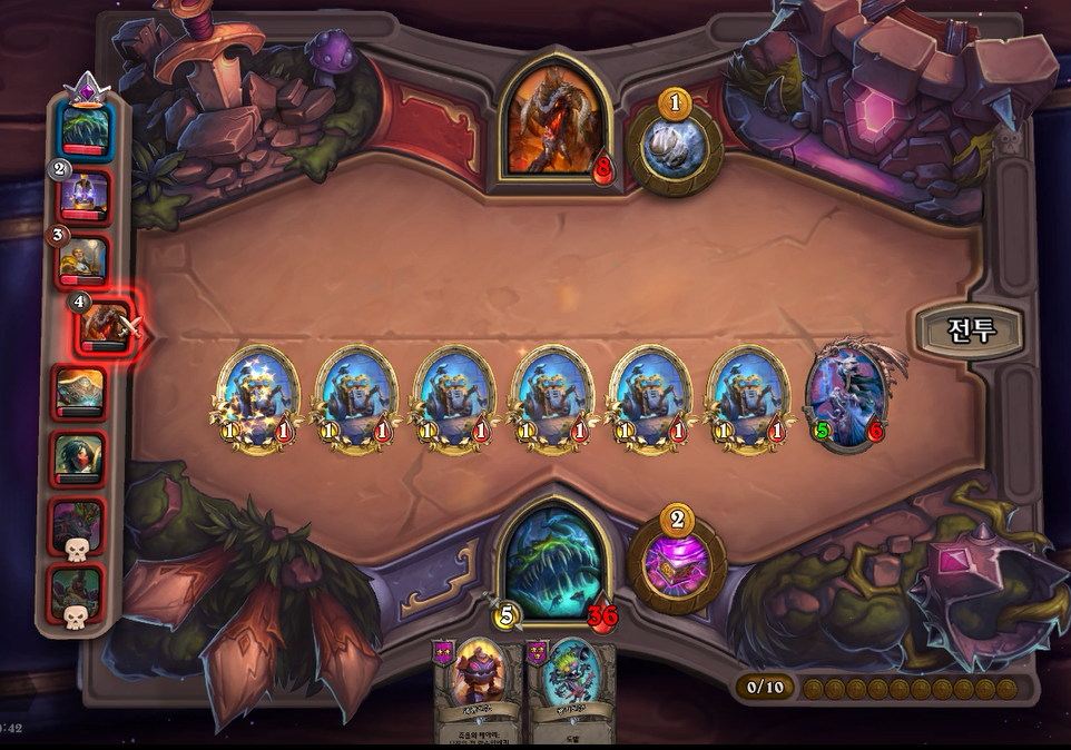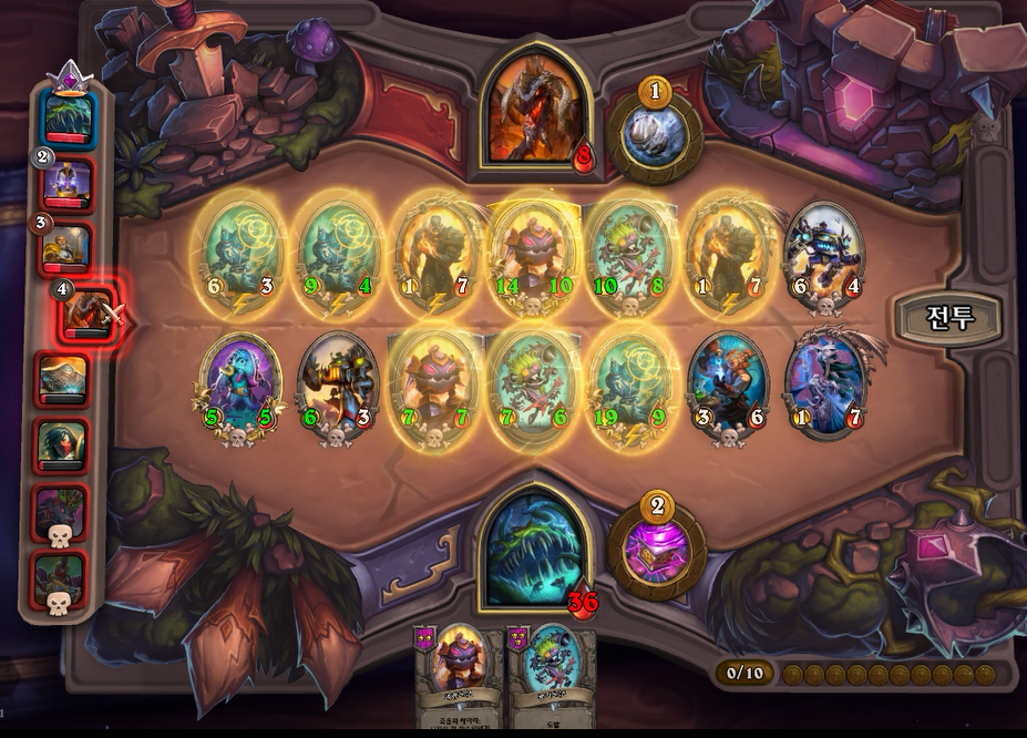 얼핏보면 상대도 강력한 필도이지만, 피조물 버프로 제가 이길수 있었고, 상대에게 6피해를 입혔습니다. 상대는 하필또 악마를 갔는데 체력 7이면 사실상 순방하기도 힘들거같네요.