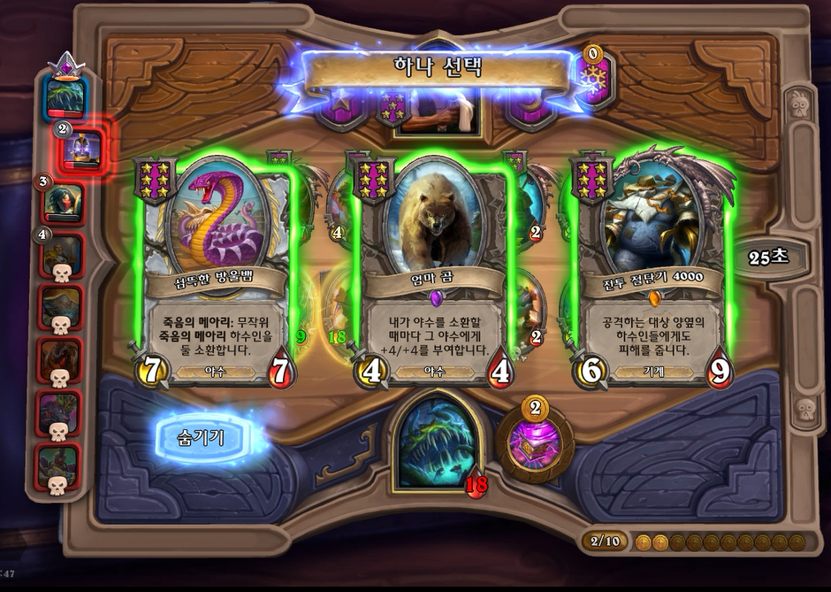 14턴에 드디어 광기로봇을 황금카드로 만들었습니다. 그런데 실수로 엄마곰을 선택했습니다. 원래는 방울뱀누르려다가 잘못눌렸네요 ㅠㅠ.그래도 이번에 칸고르가 느조스의 피조물보다 먼저죽고, 그다음 바로 느조스의 피조물이 죽으면서 운좋게 이길수 있었습니다.