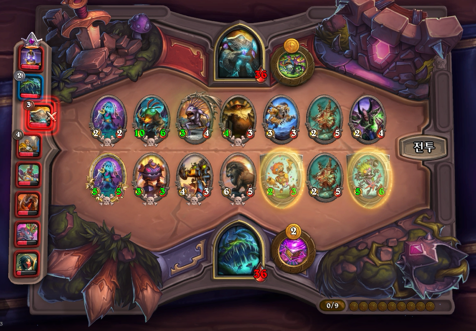 이번턴에서는 아쉽게도 콰광이나 광기로봇 페어가 나오지않았네요. 대신에 아르거스, 튼튼 껍질, 표범으로 버프를 잔뜩 발라주었습니다. 하지만 90%완성된 야수였기에 아쉽게 졌습니다.