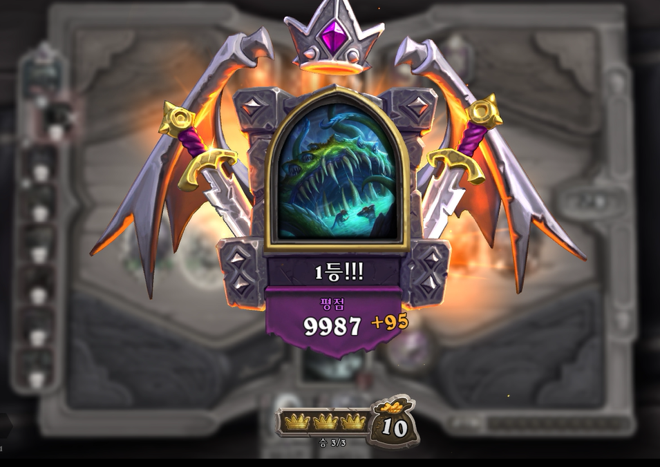 초반부터 강력한 필드를 형성해서 완벽하게 우승을 차지했습니다. 특히 요그샤론은 야수, 멀록, 기계덱 모두 무난하게 갈수 있어 제가 가장 좋아하는 영웅입니다. 저의 통계표에서는 가장 많이 플레이한 영웅 & 가장 많이 승리안 영웅에 1위입니다. 만능 영웅이다보니 항상 요그샤론을 고르게 됩니다ㅎㅎ.