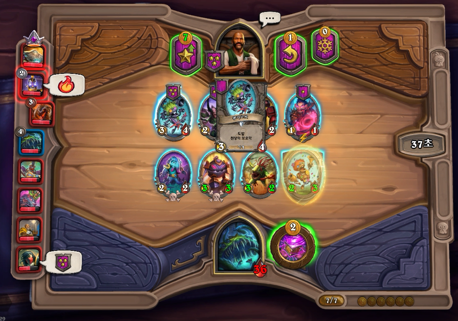 5턴(7코스트) 하수인상점입니다. 위 스크린샷과 같이 광기로봇 + 벌목기를 구매했습니다. 4개의 하수인 중 1개체만 사고 싶을 경우에는 굳이 영능을 쓸필요는 없습니다. 지금처럼 3성 하수인이 2개면 7코스트 타이밍에 필드가 강력해집니다. 상대 네파리안은 7코스트때 하수인 구매+레벨업을 하기때문에 무난하게 이겼습니다.