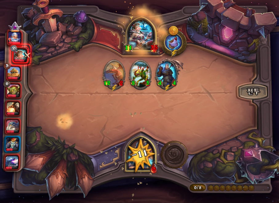 6) 공격은 왼쪽부터 순서대로 상대의 랜덤 하수인을 공격합니다.(도발 하수인이 있을 경우, 그 하수인부터 공격합니다.) 또한 죽음의 메아리, 기선 제압 발동 순서도 왼쪽부터입니다.
