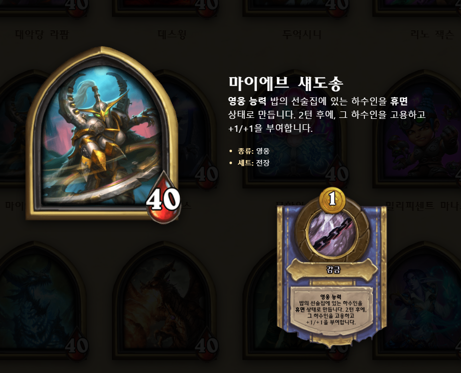마이에브 섀도송의 영웅 능력은 밥의 선술집에 있는 하수인을 휴면 상태로 만듭니다. 2턴 후에, 그 하수인을 고용하고 +1/+1을 부여합니다. 솔직히 패치노트만 읽었을 때는 휴면이 매우 안 좋아도 라팜식 운영을 하면 충분히 좋을 것 같다고 생각했습니다. 그런데 휴면이 되면 상점 하수인 자리를 차지하는 것 때문에 리롤을 했을 때 꽤나 큰 제약이 되었습니다. 이 때문에 마이에브를 C급으로 매겼고, 빠른 시일 내 패치가 되어야 할 부분이라고 생각됩니다....