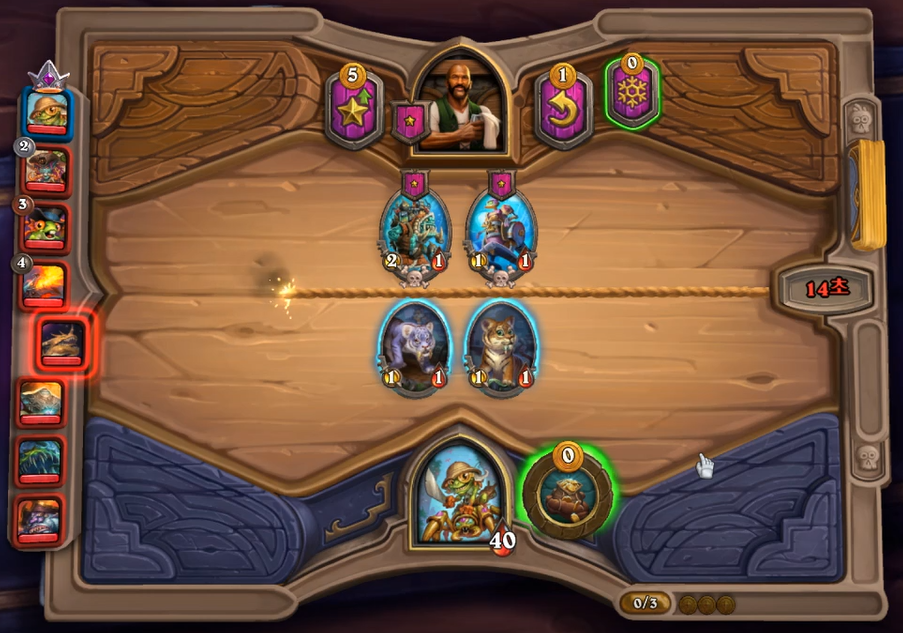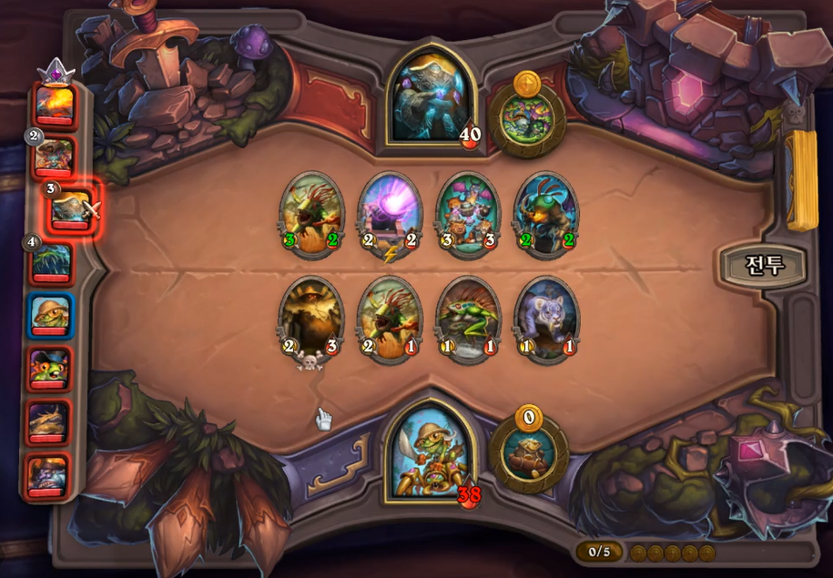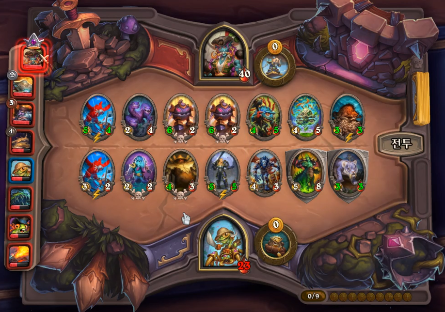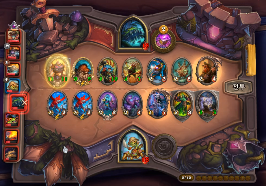 이 뒤로는 크게 설명드릴 게 없어 마지막 상점으로 건너뛰겠습니다. 참고로 히드라는 2개를 쓰는 게 좋기 때문에 황금 카드를 만들지 않았습니다. 그리고 잽 슬라이윅보다 앵무가 선공을 하는 것이 이 덱의 핵심이기 때문에 내지 않았습니다.