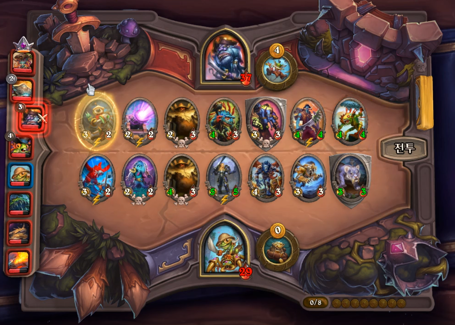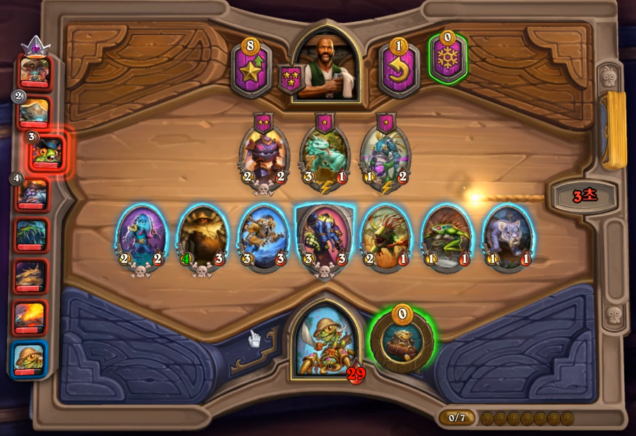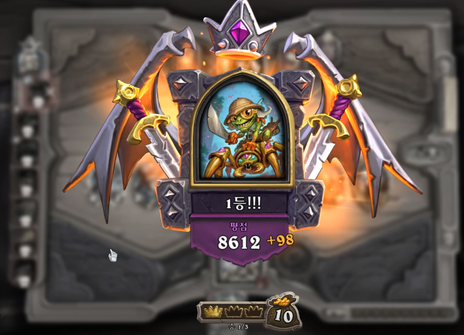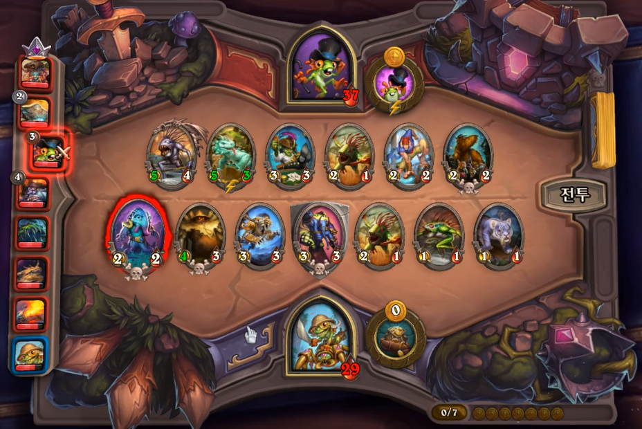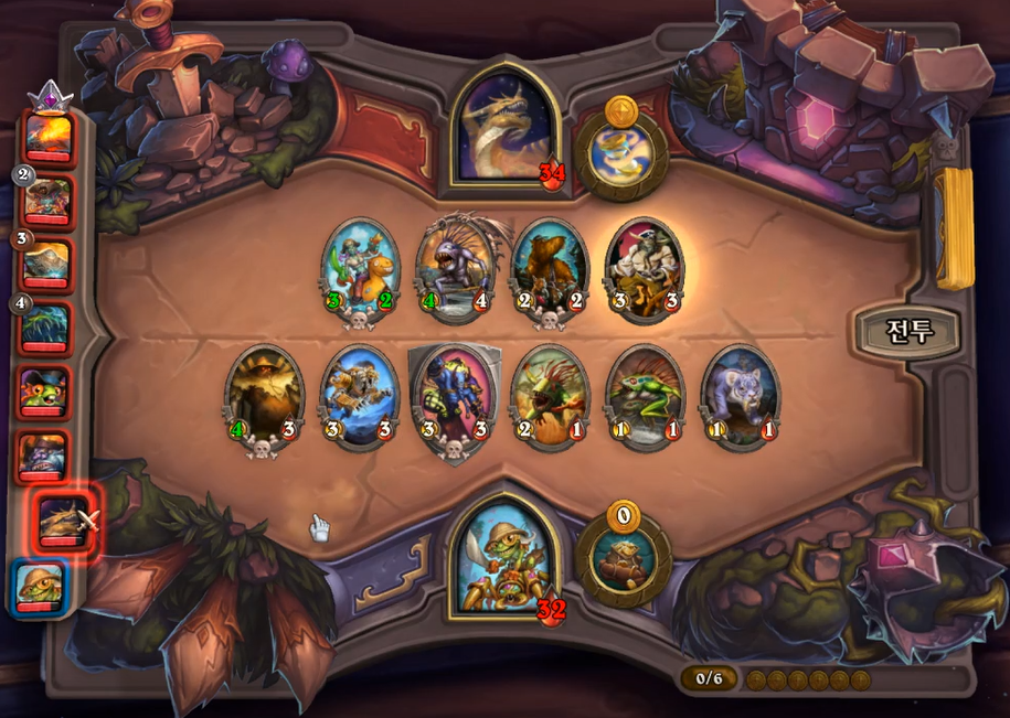 크라그의 영웅 능력은 0골드로 이번 턴에만 1 골드를 얻습니다. 대신, 매턴 골드량이 증가하기 때문에 2 턴에는 2 골드, 3 턴에는 3 골드를 얻습니다. 영웅 능력은 개인적인 느낌으로는 7 턴 이후로 써야 이득을 볼 수 있기에 후반형 영웅이라고 느꼈습니다. 9 골드 타이밍까지는 알렉스트라자, 리노 잭슨처럼 맞다가 10 골드에 5 레벨을 찍고, 영웅 능력을 사용하고, 5성 하수인을 구매해서 필드를 개편하는 느낌으로 운영하니 나름 괜찮았습니다. 물론 이런 후반형 영웅 능력 특성상 S급은 되지 못하지만, 알렉이나 리노 잭슨보다는 훨씬 안정적인 느낌이었습니다.(B급 정도) 특별한 운영법은 없기에 플레이 리뷰로 바로 넘어가겠습니다. 이번 플레이는 아메리카 서버에서 했고, 핀리로 크라그를 뽑았습니다. 그리고 앵무 야수 덱으로 1등을 차지했습니다. 해적 패치 이후로는 개인적인 느낌으로 야수 덱이 1 티어 같네요.