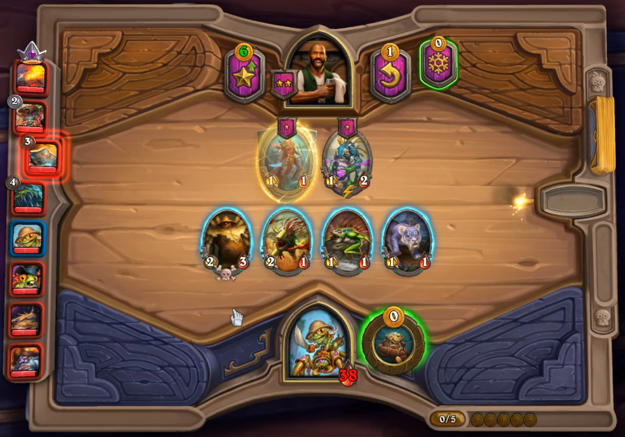 5 턴 하수인 상점입니다. 레벨업을 하였고, 다행히도 느조스의 피조물이 떴습니다! 이러면 전체 +6/+6 버프이기에 필드가 확실히 세졌습니다.