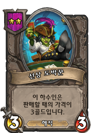 후반 : 들창코가 있으면 굉장히 좋으나 없어도 해적 사고 팔기를 하고, 남쪽 바다 폭력배(구매한 해적 하수인 하나당 +1/+1 부여)를 통해 해적들의 스탯을 지속적으로 버프 할 수 있다. 이것이 아니더라도 해적 황금 카드를 맞출 수 있기 때문에 다양한 해적 시너지 덱을 밎추기 좋다.
