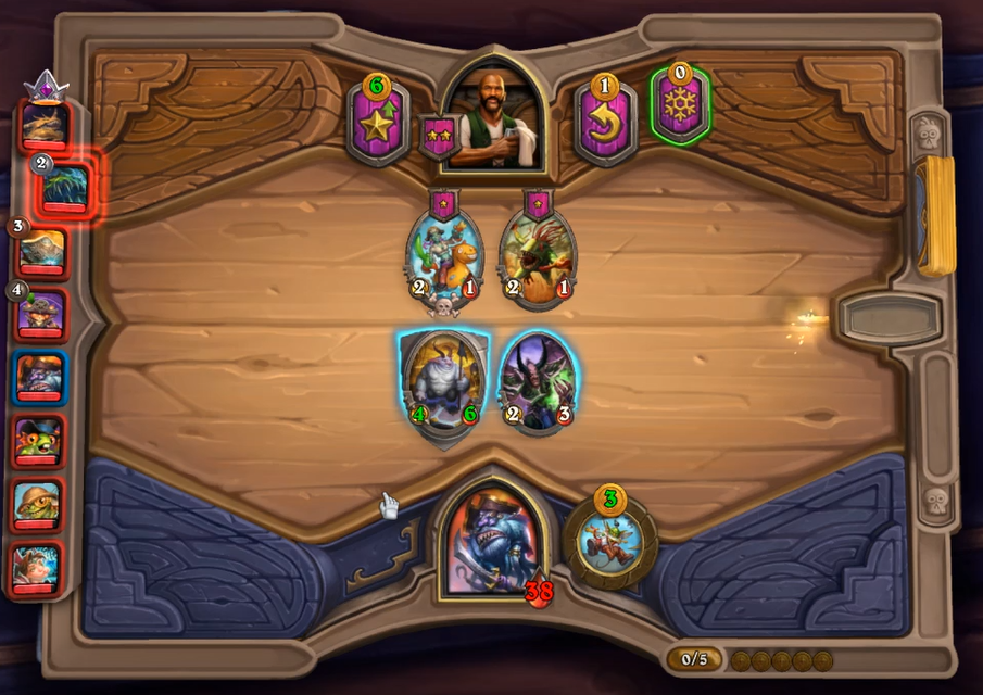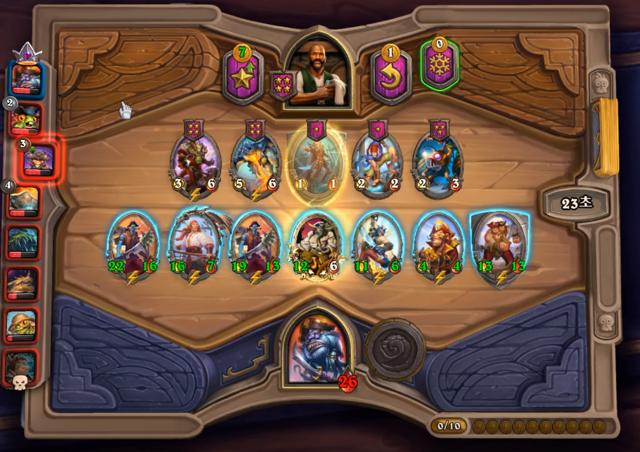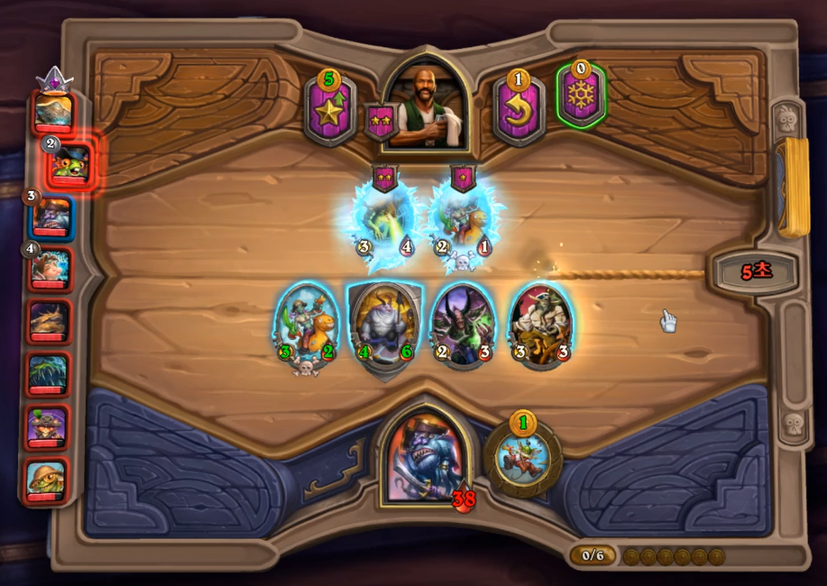 6 턴 하수인 상점입니다. 순서를 살짝 실수했지만 굉장히 필드가 세졌습니다. 이 정도면 8 골드 타이밍에 매우 세다고 생각합니다ㅇㅅㅇ; 해적은 필드에 내는 순서가 중요하기에 영상도 넣었으니 봐주시기 바랍니다ㅎㅎ;
