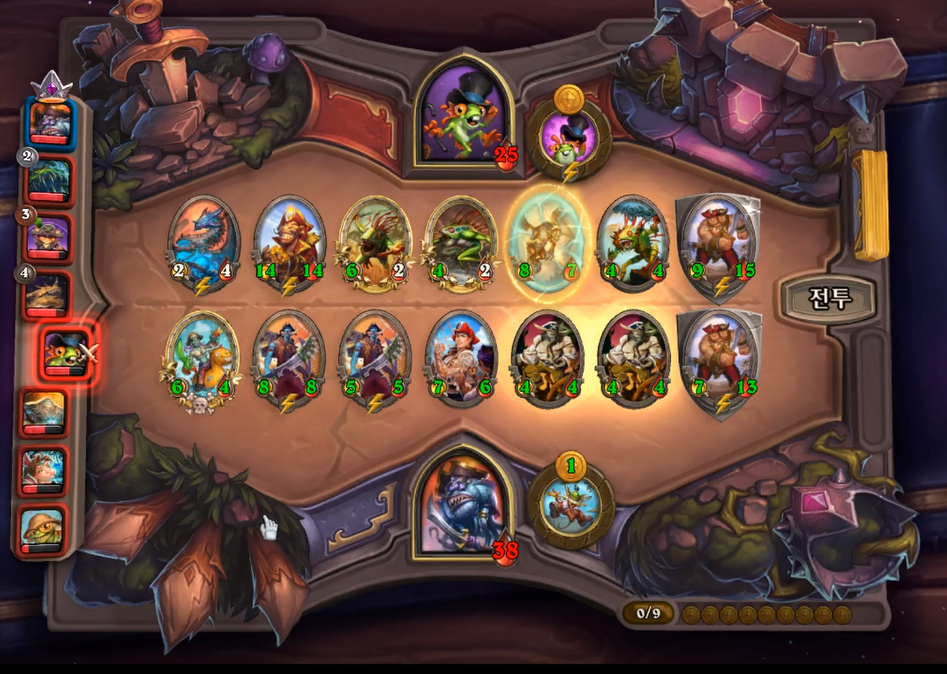 9턴 하수인 상점입니다. 레벨업을 했어도 괜찮았는데, 노략꾼 황카를 띄우고 싶었고, 약간 애매하다고 생각이 들어 하수인들을 버프 했습니다. 무엇보다 상대 유도라가 전턴에 다른 상대에게 20데미지를 넣었길래 약간 불안했습니다.