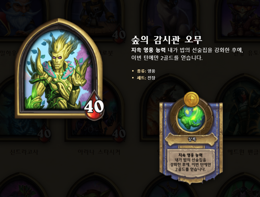 숲의 감시관 같은 경우, 확실한 바텐더 상위호환이며, 남들보다 패스트 레벨 업을 부담없어 할 수 있어 좋다고 생각합니다. 영웅 능력 자체가 패시브 능력이다보니 난이도도 어렵지 않다고 생각합니다. 초반에 강력한 영웅들을 만나도 생각보다 체력관리가 잘되고, 중반만 넘어가도 남들보다 1~2템포 빠른 덱을 전개할 수 있어 좋은 영웅이라고생각합니다.