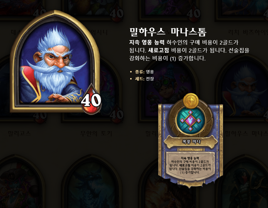 밀리피센트 마나스톰 같은 경우 4레벨에서 오래 머무르면서 기계 하수인들만 구매해주면 2,3등을 하기 좋은 영이라고 생각합니다. 특히 합체 하수인(안녕 모듈, 증식하는 위협)들에게도 영웅능력이 들어가기 때문에 중반에 가장 강력하다고 생각합니다.