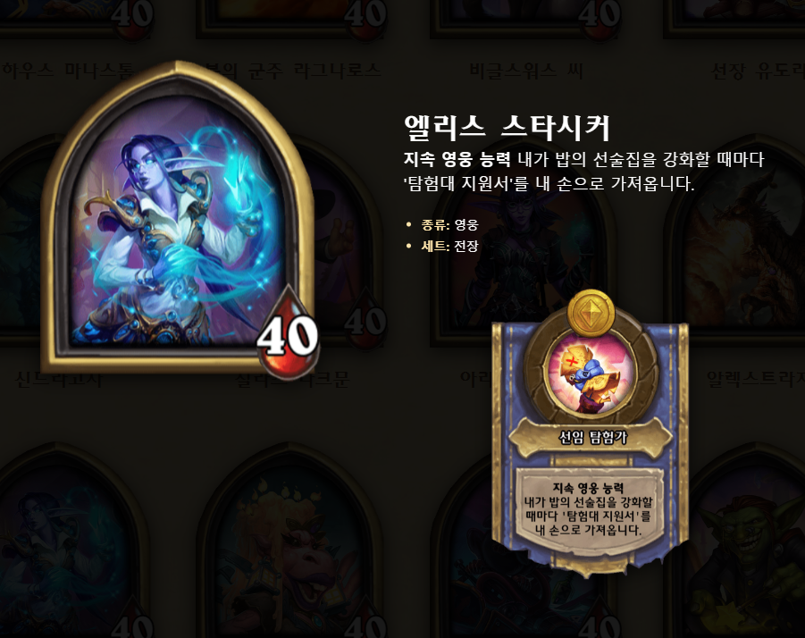 엘리스 스타시커는 탐험대 지원서가 2코스트로 바퀴면서 오무급 레벨업 타이밍을 가지게 되었습니다. 비용 2로 한단계 높은 하수인을 뽑기 때문에 골드 이득을 보면서 패스트 레벨업이 되며 이를 바탕으로 빠른 빌드업이 가능하여 S급 티어로 올라왔다고 생각합니다.