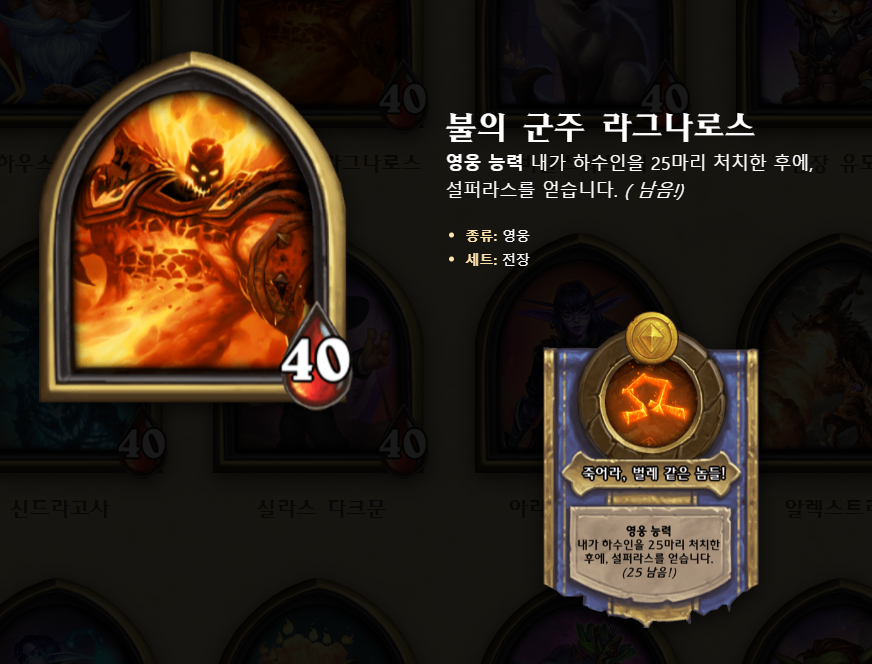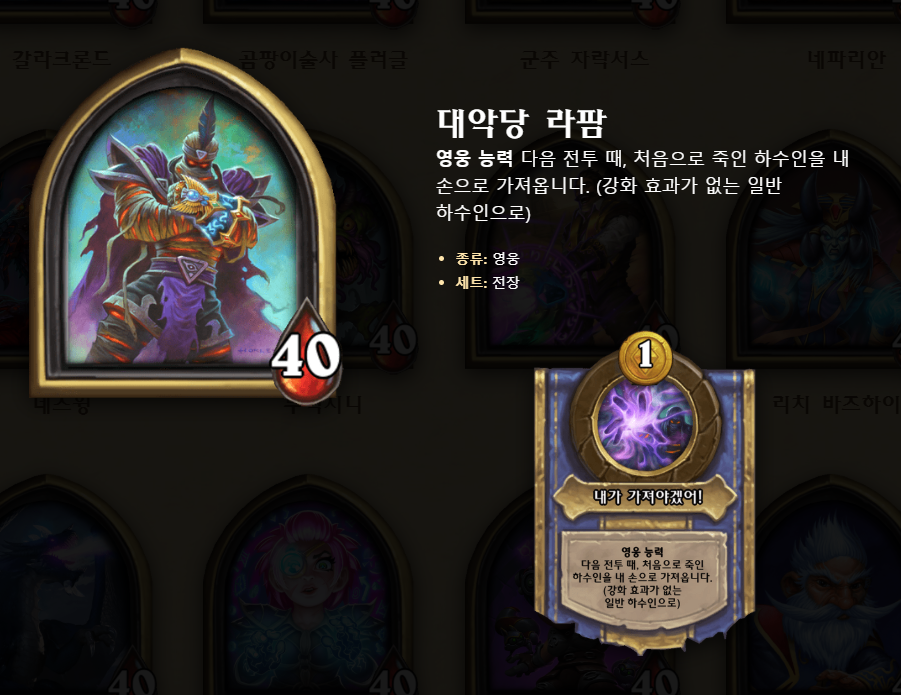 알아키르같은 경우, 리치왕과 비슷하다고 생각합니다. 다만, 배치에 제약이 걸리기 때문에 하위호환이라는 생각은 드네요. 그렇지만, 초반, 중반까지 매우 강력하고, 특히 앵무야수덱을 하면 시너지가 매우 좋다고 생각합니다. 또한 맨 왼쪽에 독성하수인을 놓으면 최소 2인분도 가능하기 때문에 영웅 능력 가치는 꽤 높은 편이라고 생각합니다.
