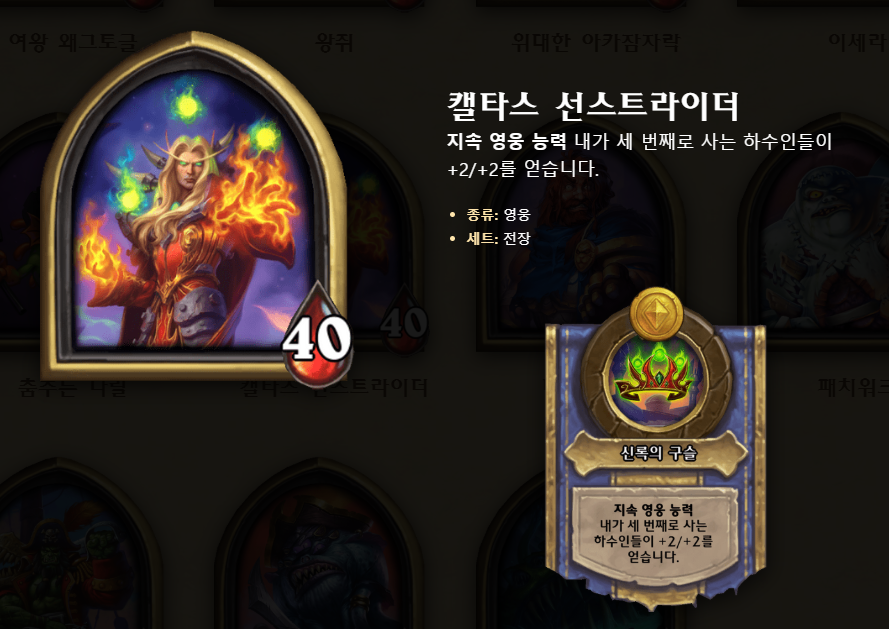 캘타스 또한 무상성 영웅이고, 초반의 강력한 +2/+2 버프를 바탕으로 초중반을 무난히 넘기고, 후반에 덱을 맞추는 운영을 하시면 됩니다. 캘타스야말로 현 메타에서 순방 머신이지 않나 싶습니다.