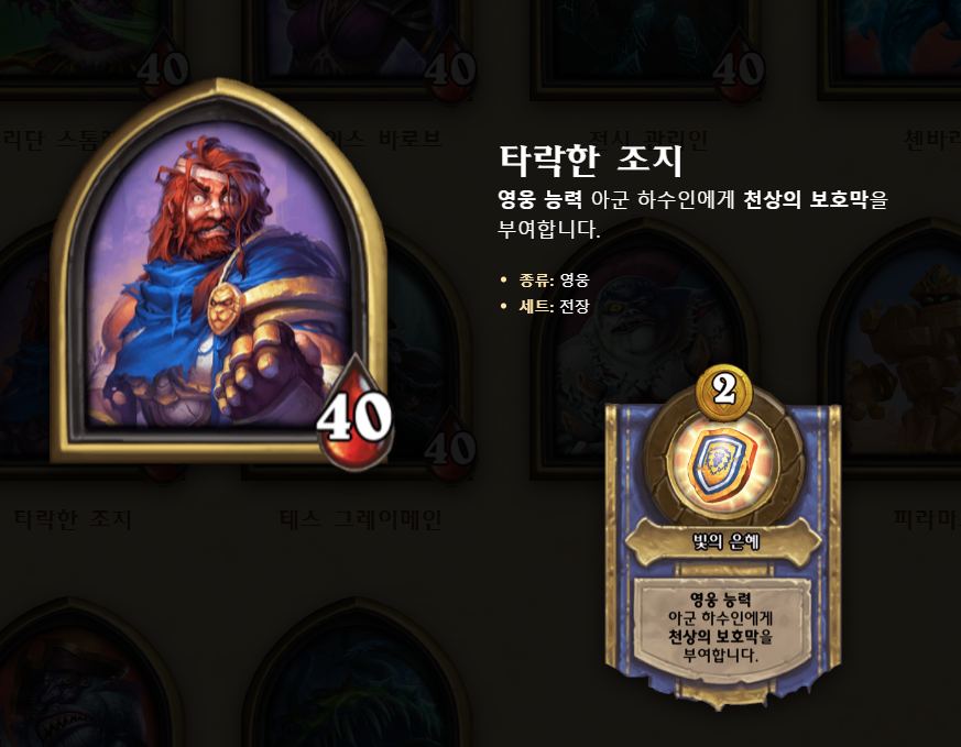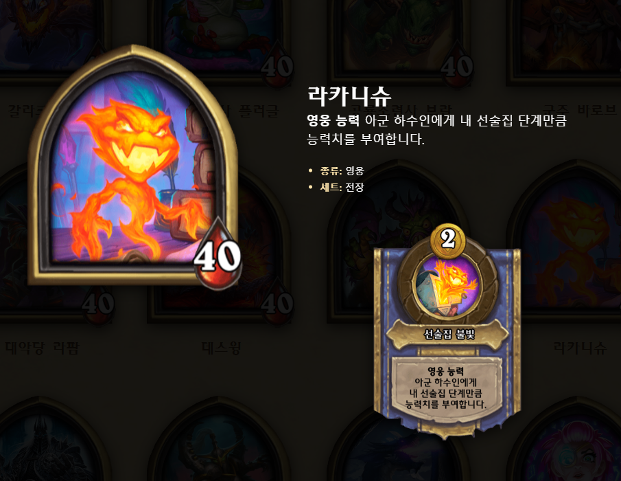 라카니슈 또한 무작위에서 지정으로 버프되면서 2티어에 위치시켰습니다. 2코스트라는 높은 비용은 확실히 부담되지만, 확실한 +4/+4 버프 혹은 +5/+5 버프를 주기 때문에 영웅 능력 가치가 충분히 높다고 생각했습니다. 물론 재미가 없어서 개인적으로 좋아하지 않습니다ㅇㅅㅇ;