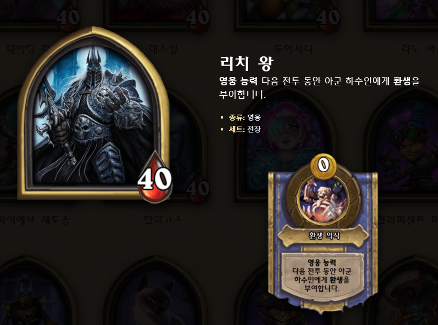 3번째 S티어 영웅은 오랫동안 관짝에 있다가 세상 밖으로 나온 리치 왕입니다. 영웅 능력이 0코스트가 되면서 초중반을 무난하게 넘길 수 있고, 느조스 하나만 가지고 있어도 5레벨을 무난하게 찍을 수 있기 때문에 굉장히 강력합니다. 기본적으로는 죽메 덱 위주의 야수 덱, 기계 덱을 구성해야 하지만 나디나에게 도발을 부여하고 환생을 걸어놓으면 나디나의 죽음의 메아리를 2번 발동 시킬 수도 있어 상황이 잘 풀리면 강력한 용 덱도 짜실 수 있습니다. 1,2 턴 승리는 기본이고, 적어도 8턴까지는 리치왕이 매우 강력하다고 생각합니다. 아마 다음 패치 때 다시 너프가 되지 않을까 예측해 봅니다.